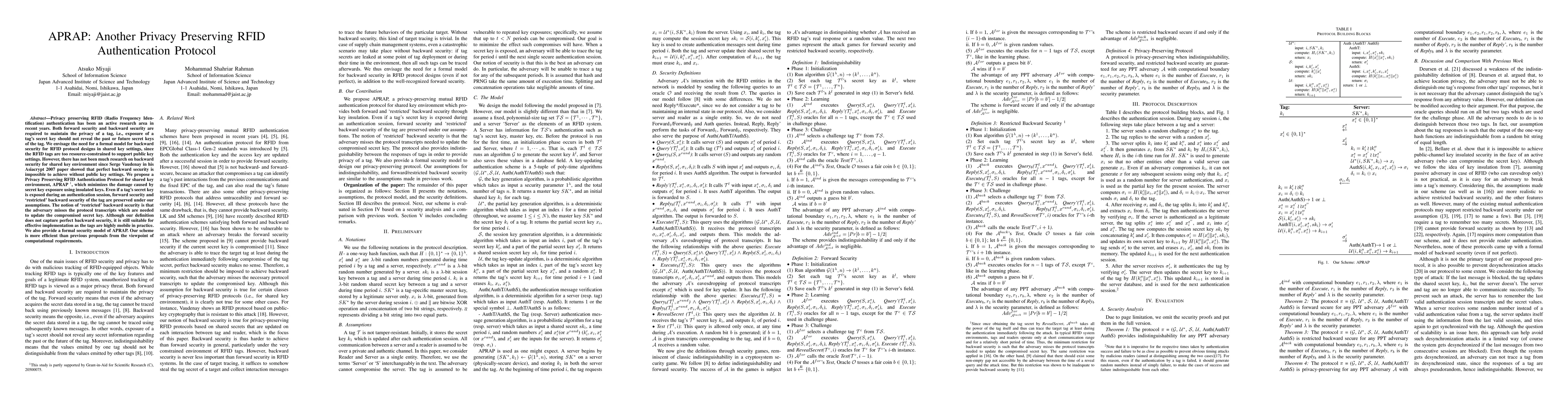 The paper proposes APRAP, a Privacy Preserving RFID Authentication Protocol for shared key environments, which aims to minimize the damage from secret key exposure through insulated keys, preserving forward security and 'restricted' backward security suitable for resource-constrained RFID tags. The scheme is computationally more efficient than previous proposals.