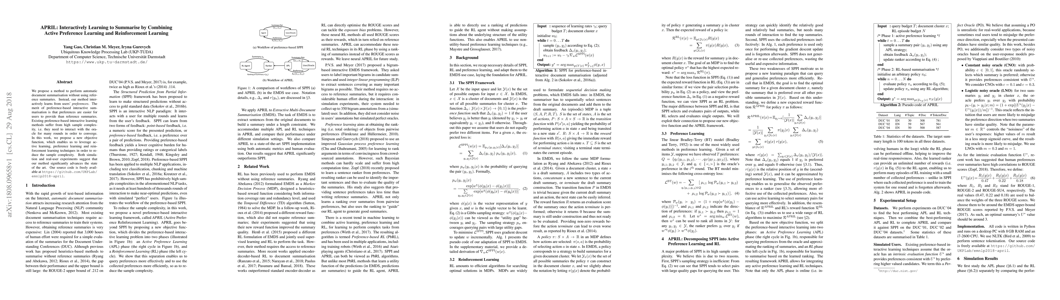 This paper introduces APRIL, a novel method for automatic document summarisation that leverages active learning, preference learning, and reinforcement learning to reduce sample complexity. Unlike traditional methods, APRIL interactively learns from user preferences, which are easier to provide than reference summaries, thus significantly advancing the state of the art.