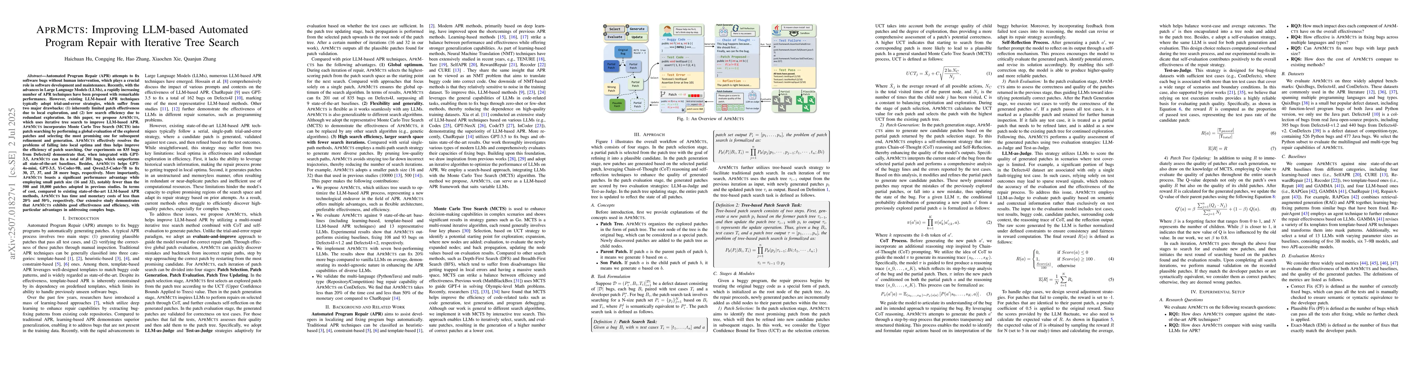 The paper introduces APRMCTS, a method that enhances LLM-based Automated Program Repair using iterative tree search. APRMCTS incorporates Monte Carlo Tree Search (MCTS) for global patch evaluation, improving effectiveness and efficiency. Experiments on Defects4J show APRMCTS fixes 201 bugs with smaller patch sizes and lower costs compared to state-of-the-art methods, demonstrating superior performance, particularly for complex bugs.