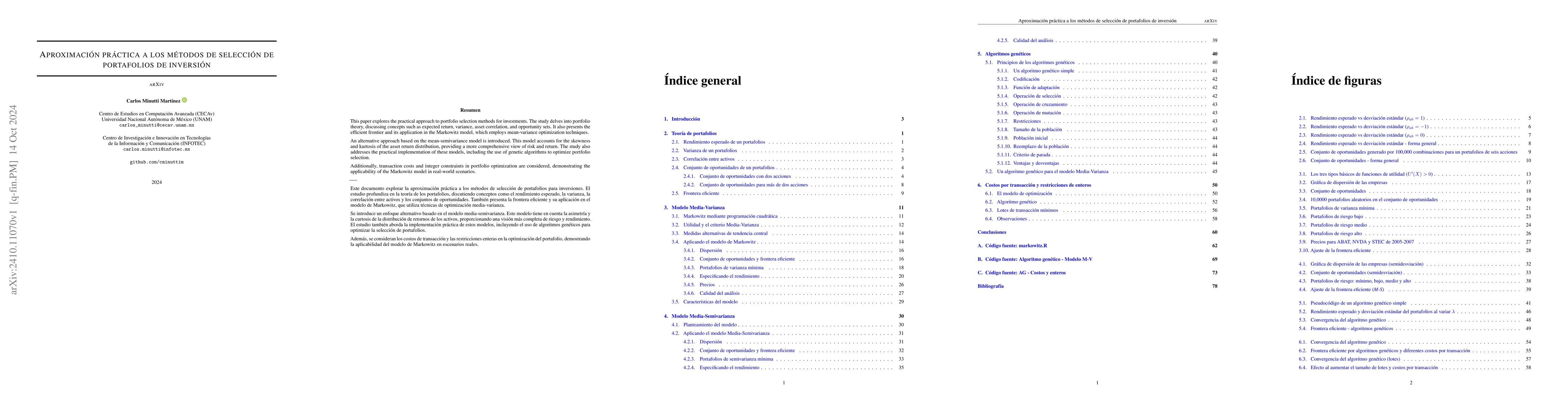 Este artículo examina un enfoque práctico para los métodos de selección de carteras de inversión, explorando la teoría de carteras, la frontera eficiente y el modelo de Markowitz con técnicas de optimización media-varianza. También introduce un modelo media-semivarianza para considerar la asimetría y la curtosis, y discute la implementación práctica con algoritmos genéticos, costos de transacción y restricciones enteras.