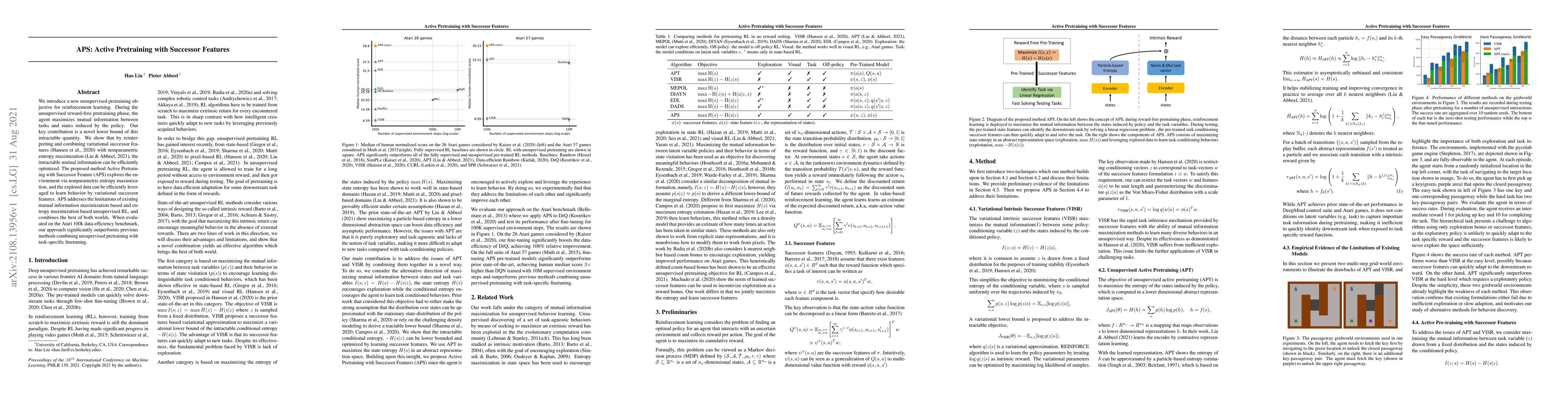 This paper proposes an unsupervised pretraining method called Active Pretraining with Successor Features (APS) that maximizes mutual information between tasks and states. APS combines variational successor features with nonparametric entropy maximization to efficiently optimize the mutual information, outperforming previous methods on the Atari 100k data-efficiency benchmark.