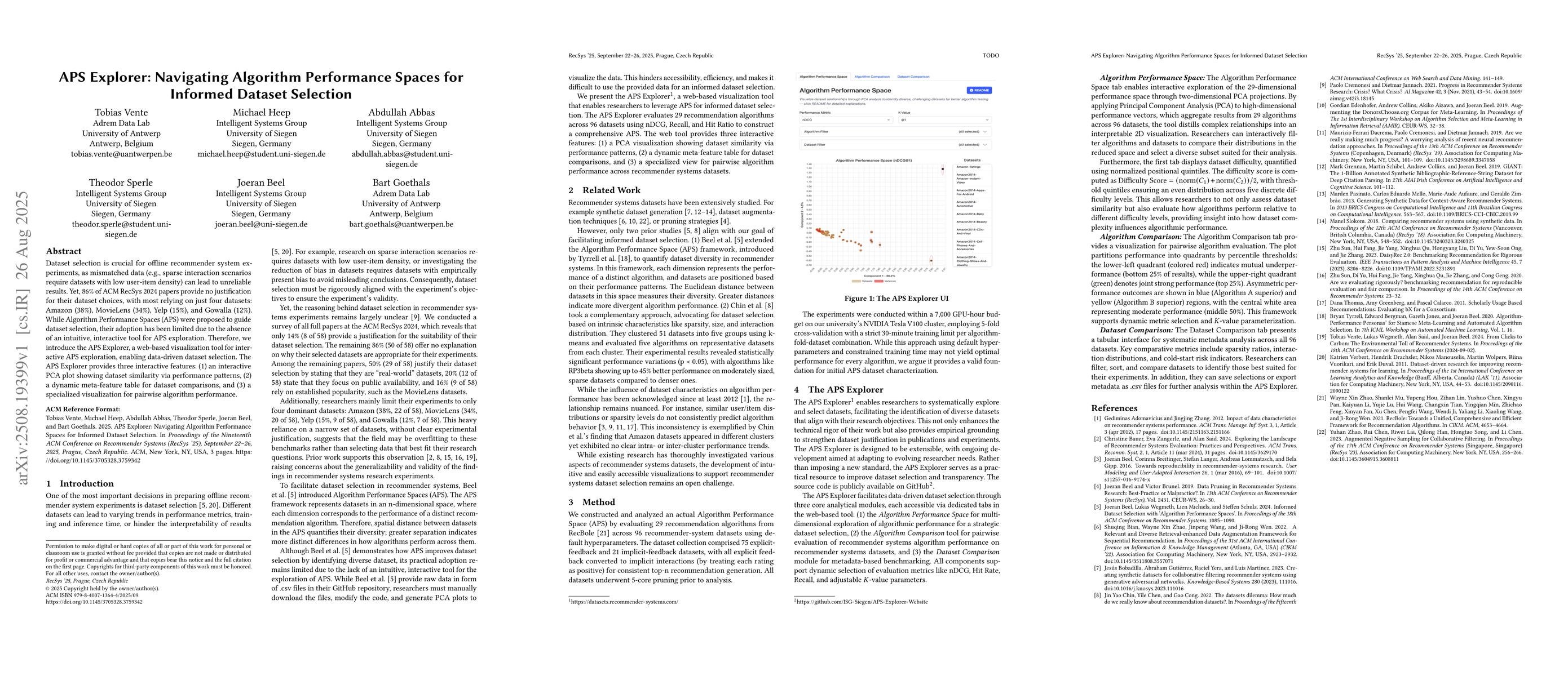 Dataset selection is crucial for offline recommender system experiments, as mismatched data (e.g., sparse interaction scenarios require datasets with low user-item density) can lead to unreliable results. Yet, 86\% of ACM RecSys 2024 papers provide no justification for their dataset choices, with most relying on just four datasets: Amazon (38\%), MovieLens (34\%), Yelp (15\%), and Gowalla (12\%). While Algorithm Performance Spaces (APS) were proposed to guide dataset selection, their adoption has been limited due to the absence of an intuitive, interactive tool for APS exploration. Therefore, we introduce the APS Explorer, a web-based visualization tool for interactive APS exploration, enabling data-driven dataset selection. The APS Explorer provides three interactive features: (1) an interactive PCA plot showing dataset similarity via performance patterns, (2) a dynamic meta-feature table for dataset comparisons, and (3) a specialized visualization for pairwise algorithm performance.