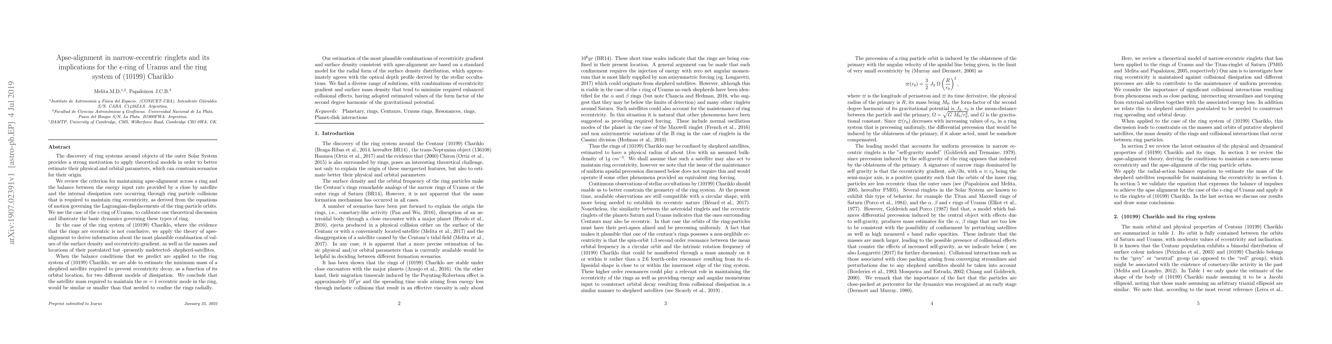 Research explores how to maintain apse-alignment in ring systems of outer Solar System objects, using simulations for the Uranus epsilon-ring and Chariklo's ring system.
