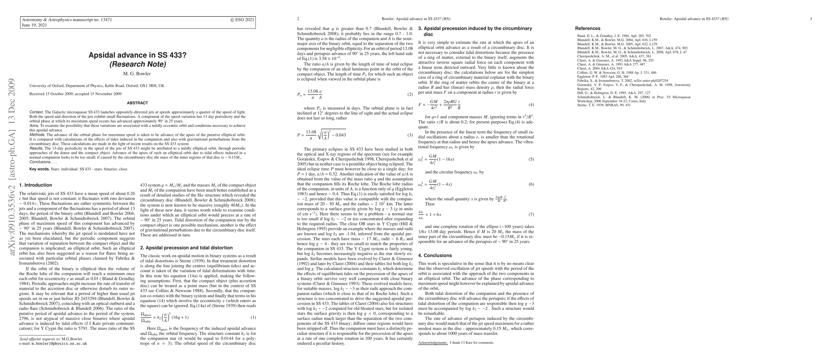Context. The Galactic microquasar SS 433 launches oppositely directed jets at speeds approximately a quarter of the speed of light. Both the speed and direction of the jets exhibit small fluctuations. A component of the speed variation has 13 day periodicity and the orbital phase at which its maximum speed occurs has advanced approximately 90 degrees in 25 years. Aims. To examine the possibility that these variations are associated with a mildly eccentric orbit and conditions necessary to achieve this apsidal advance. Methods. The advance of the orbital phase for maximum speed is taken to be advance of the apses of the putative elliptical orbit. It is compared with calculations of the effects of tides induced in the companion and also with gravitational perturbations from the circumbinary disc. These calculations are made in the light of recent results on the SS 433 system. Results. The 13 day periodicity in the speed of the jets of SS 433 might be attributed to a mildly elliptical orbit, through periodic approaches of the donor and the compact object. Advance of the apses of such an elliptical orbit due to tidal effects induced in a normal companion looks to be to small; if caused by the circumbinary disc the mass of the inner regions of that disc is ~ 0.15 solar masses.