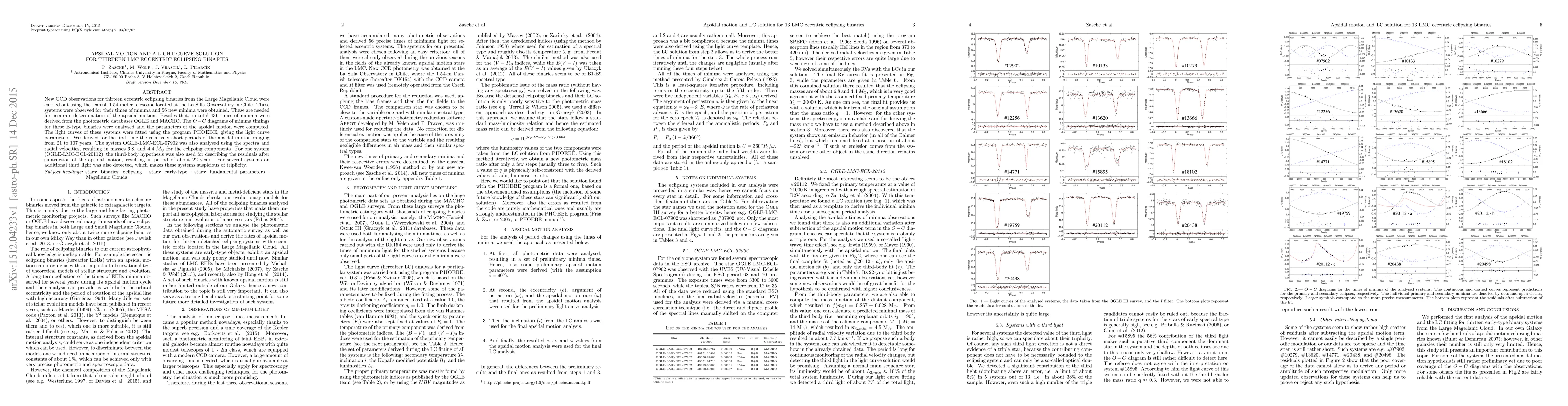 New CCD observations for thirteen eccentric eclipsing binaries from the Large Magellanic Cloud were carried out using the Danish 1.54-meter telescope located at the La Silla Observatory in Chile. These systems were observed for their times of minima and 56 new minima were obtained. These are needed for accurate determination of the apsidal motion. Besides that, in total 436 times of minima were derived from the photometric databases OGLE and MACHO. The (O-C) diagrams of minima timings for these B-type binaries were analysed and the parameters of the apsidal motion were computed. The light curves of these systems were fitted using the program PHOEBE, giving the light curve parameters. We derived for the first time the relatively short periods of the apsidal motion ranging from 21 to 107 years. The system OGLE-LMC-ECL-07902 was also analysed using the spectra and radial velocities, resulting in masses 6.8, and 4.4 M0 for the eclipsing components. For one system (OGLE-LMC-ECL-20112), the third-body hypothesis was also used for describing the residuals after subtraction of the apsidal motion, resulting in period of about 22 years. For several systems an additional third light was also detected, which makes these systems suspicious of triplicity. Based on data collected with the Danish 1.54-m telescope at the ESO La Silla Observatory.