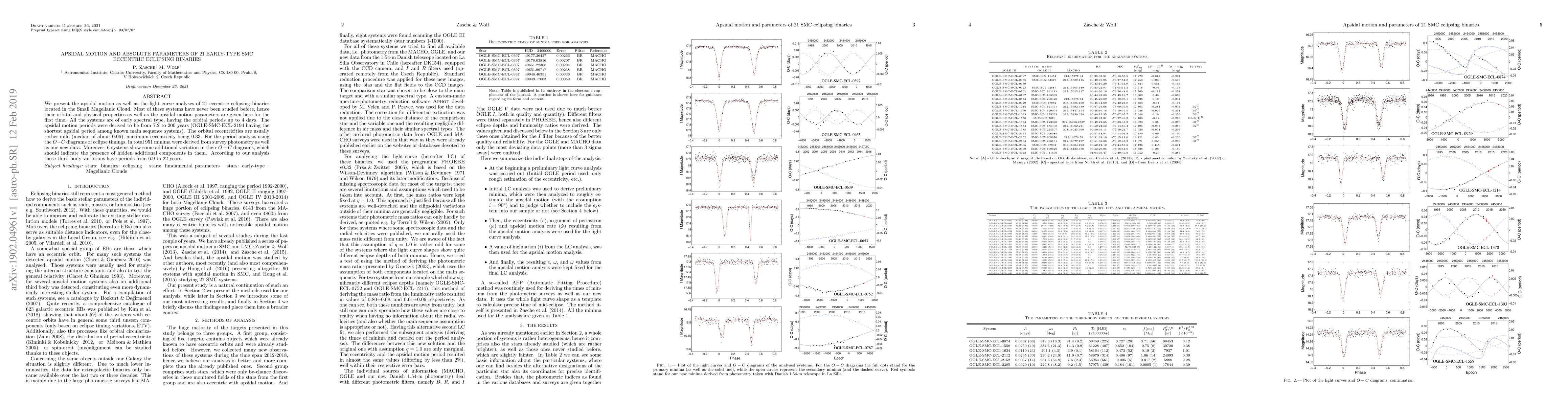 We present the apsidal motion and light-curve analyses of 21 eccentric eclipsing binaries located in the Small Magellanic Cloud. Most of these systems have never been studied before, hence their orbital and physical properties as well as the apsidal motion parameters are given here for the first time. All the systems are of early spectral type, having orbital periods up to 4 days. The apsidal motion periods were derived to be from 7.2 to 200 yr (OGLE-SMC-ECL-2194 having the shortest apsidal period among known main-sequence systems). The orbital eccentricities are usually rather mild (median of about 0.06), the maximum eccentricity being 0.33. For the period analysis using O-C diagrams of eclipse timings, in total 951 minima were derived from survey photometry as well as our new data. Moreover, six systems show some additional variation in their O-C diagrams, which should indicate the presence of hidden additional components in them. According to our analysis these third-body variations have periods from 6.9 to 22 yr.