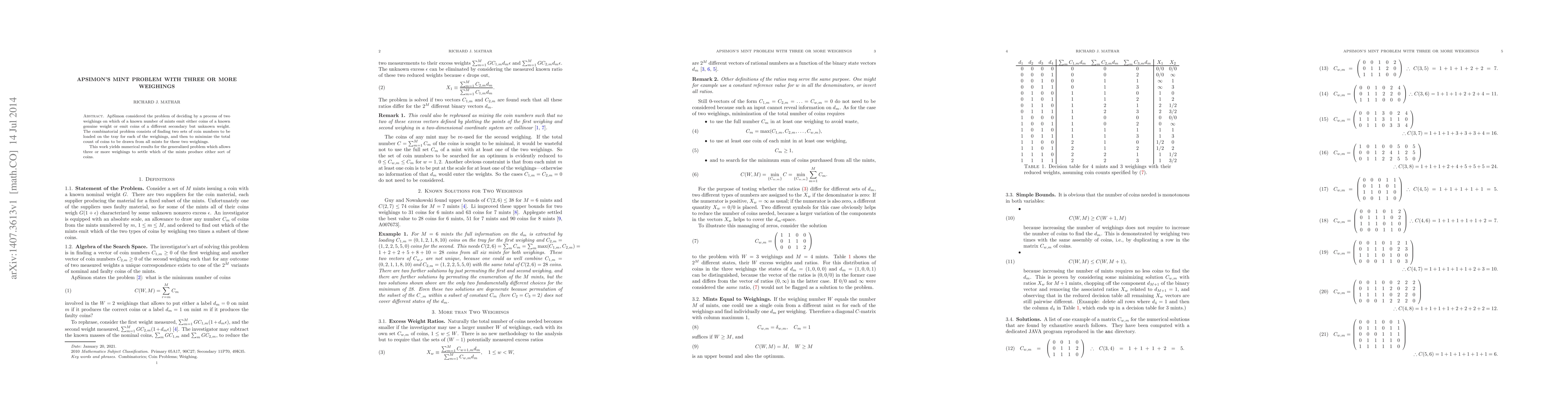 ApSimon considered the problem of deciding by a process of two weighings on which of a known number of mints emit either coins of a known genuine weight or emit coins of a different secondary but unknown weight. The combinatorial problem consists of finding two sets of coin numbers to be loaded on the tray for each of the weighings, and then to minimize the total count of coins to be drawn from all mints for these two weighings. This work yields numerical results for the generalized problem which allows three or more weighings to settle which of the mints produce either sort of coins.