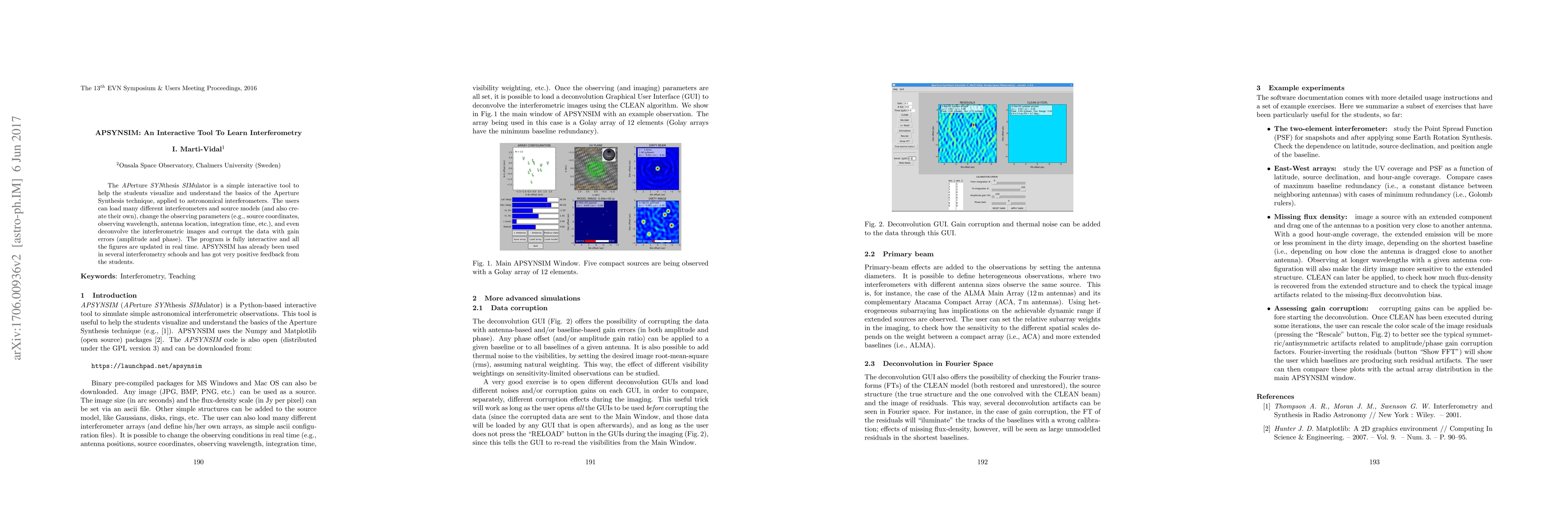 The APerture SYNthesis SIMulator is a simple interactive tool to help the students visualize and understand the basics of the Aperture Synthesis technique, applied to astronomical interferometers. The users can load many different interferometers and source models (and also create their own), change the observing parameters (e.g., source coordinates, observing wavelength, antenna location, integration time, etc.), and even deconvolve the interferometric images and corrupt the data with gain errors (amplitude and phase). The program is fully interactive and all the figures are updated in real time. APSYNSIM has already been used in several interferometry schools and has got very positive feedback from the students.