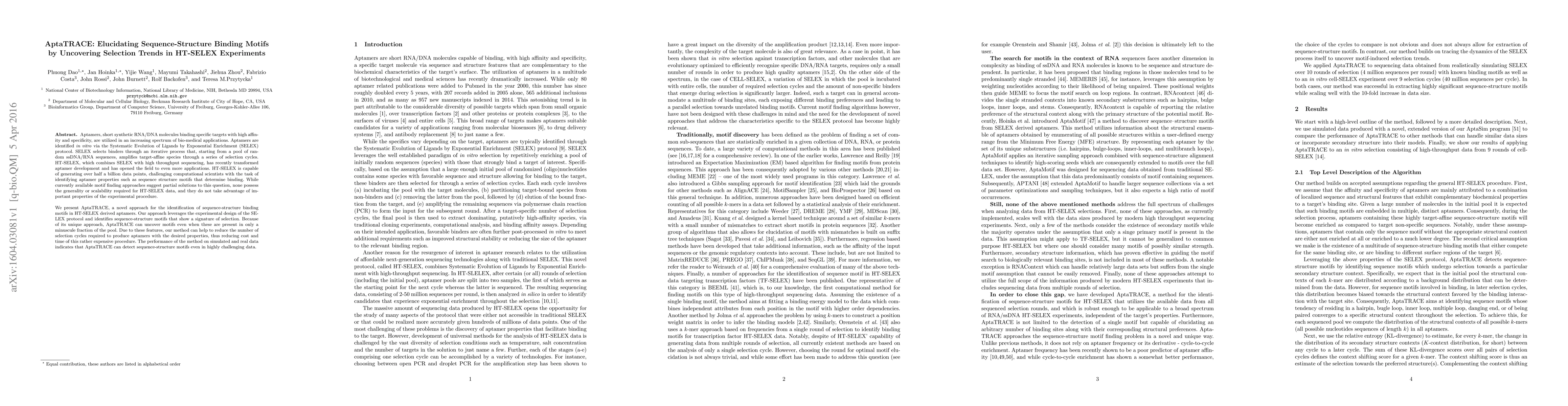AptaTRACE identifies sequence-structure binding motifs in aptamers generated through high-throughput SELEX experiments, reducing the number of selection cycles required and improving efficiency.
