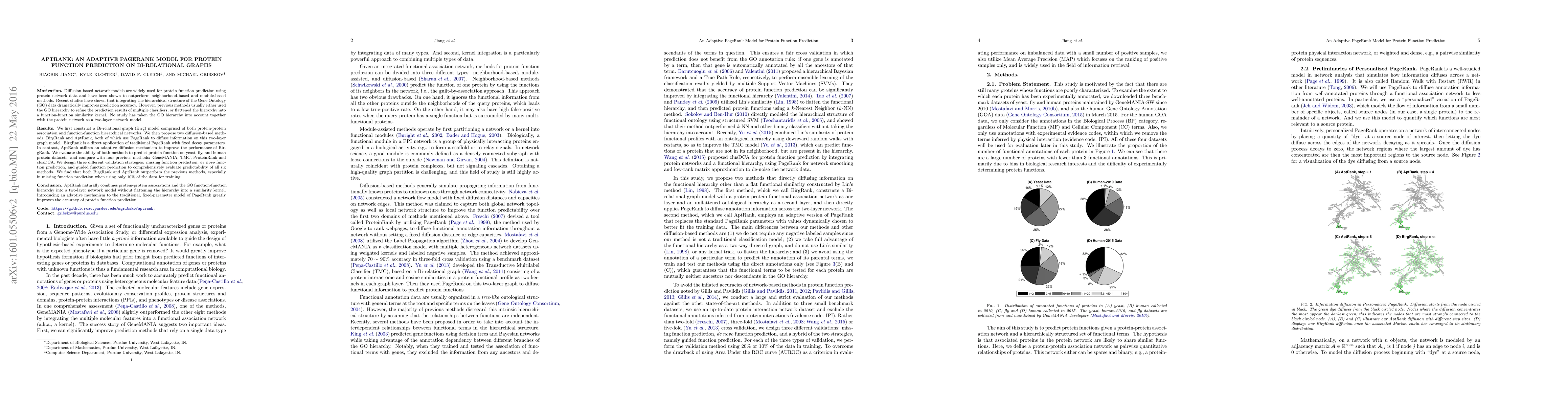 Diffusion-based network models are widely used for protein function prediction using protein network data and have been shown to outperform neighborhood- and module-based methods. Recent studies have shown that integrating the hierarchical structure of the Gene Ontology (GO) data dramatically improves prediction accuracy. However, previous methods usually either used the GO hierarchy to refine the prediction results of multiple classifiers, or flattened the hierarchy into a function-function similarity kernel. No study has taken the GO hierarchy into account together with the protein network as a two-layer network model. We first construct a Bi-relational graph (Birg) model comprised of both protein-protein association and function-function hierarchical networks. We then propose two diffusion-based methods, BirgRank and AptRank, both of which use PageRank to diffuse information on this two-layer graph model. BirgRank is an application of traditional PageRank with fixed decay parameters. In contrast, AptRank uses an adaptive mechanism to improve the performance of BirgRank. We evaluate both methods in predicting protein function on yeast, fly, and human datasets, and compare with four previous methods: GeneMANIA, TMC, ProteinRank and clusDCA. We design three validation strategies: missing function prediction, de novo function prediction, and guided function prediction to comprehensively evaluate all six methods. We find that both BirgRank and AptRank outperform the others, especially in missing function prediction when using only 10% of the data for training. AptRank combines protein-protein associations and the GO function-function hierarchy into a two-layer network model without flattening the hierarchy into a similarity kernel. Introducing an adaptive mechanism to the traditional, fixed-parameter model of PageRank greatly improves the accuracy of protein function prediction.