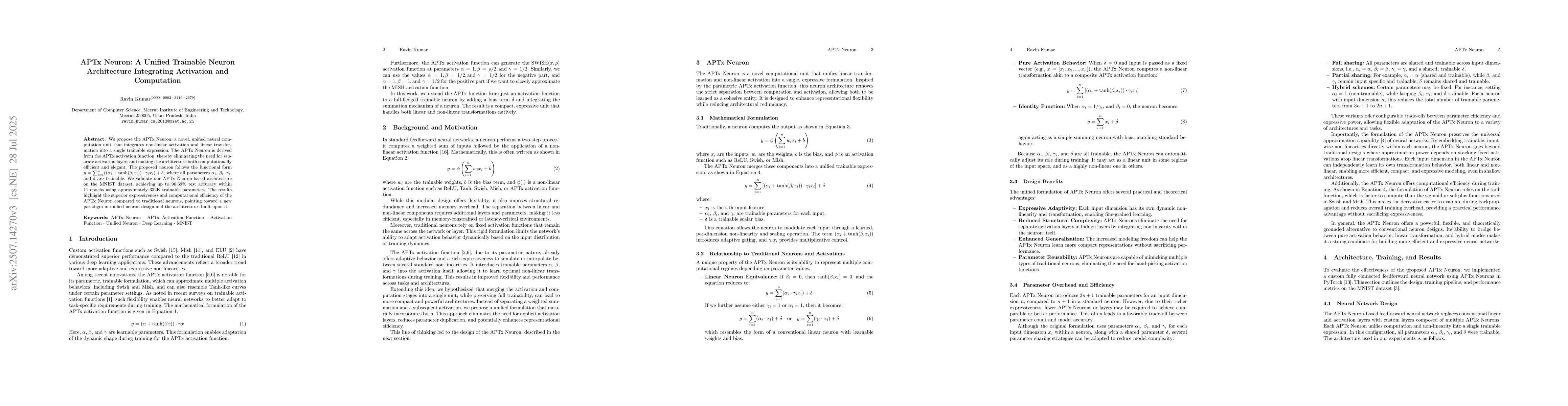 We propose the APTx Neuron, a novel, unified neural computation unit that integrates non-linear activation and linear transformation into a single trainable expression. The APTx Neuron is derived from the APTx activation function, thereby eliminating the need for separate activation layers and making the architecture both computationally efficient and elegant. The proposed neuron follows the functional form $y = \sum_{i=1}^{n} ((\alpha_i + \tanh(\beta_i x_i)) \cdot \gamma_i x_i) + \delta$, where all parameters $\alpha_i$, $\beta_i$, $\gamma_i$, and $\delta$ are trainable. We validate our APTx Neuron-based architecture on the MNIST dataset, achieving up to 96.69\% test accuracy in just 20 epochs using approximately 332K trainable parameters. The results highlight the superior expressiveness and computational efficiency of the APTx Neuron compared to traditional neurons, pointing toward a new paradigm in unified neuron design and the architectures built upon it.