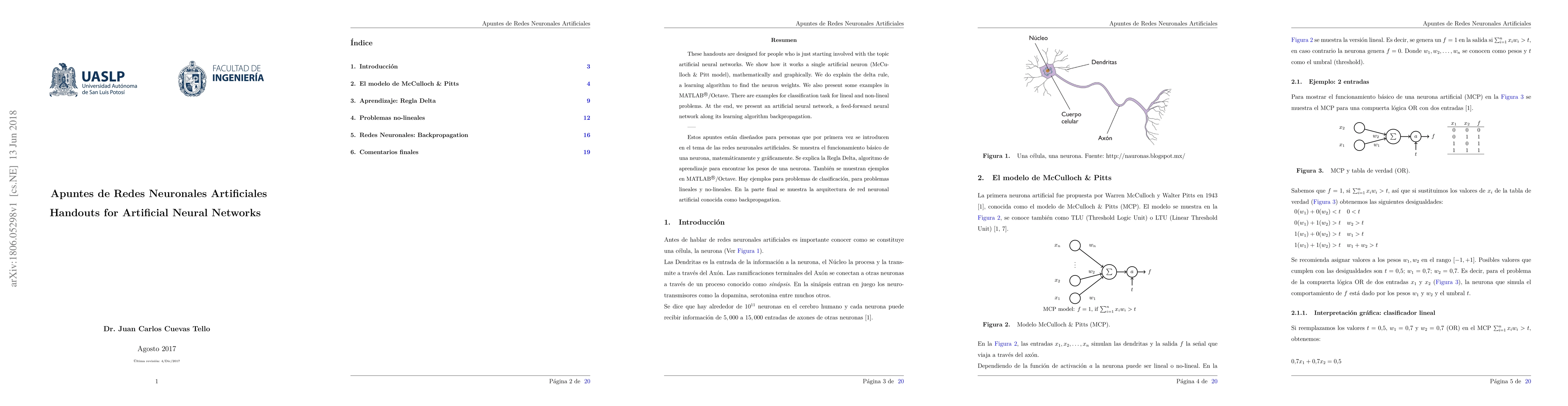 The paper explains the functioning of a single artificial neuron (McCulloch & Pitts model) both mathematically and graphically. It introduces the delta rule, a learning algorithm to determine neuron weights, and provides MATLAB/Octave examples for classification tasks, both linear and non-linear problems. The paper also presents a feed-forward neural network along with its backpropagation learning algorithm.