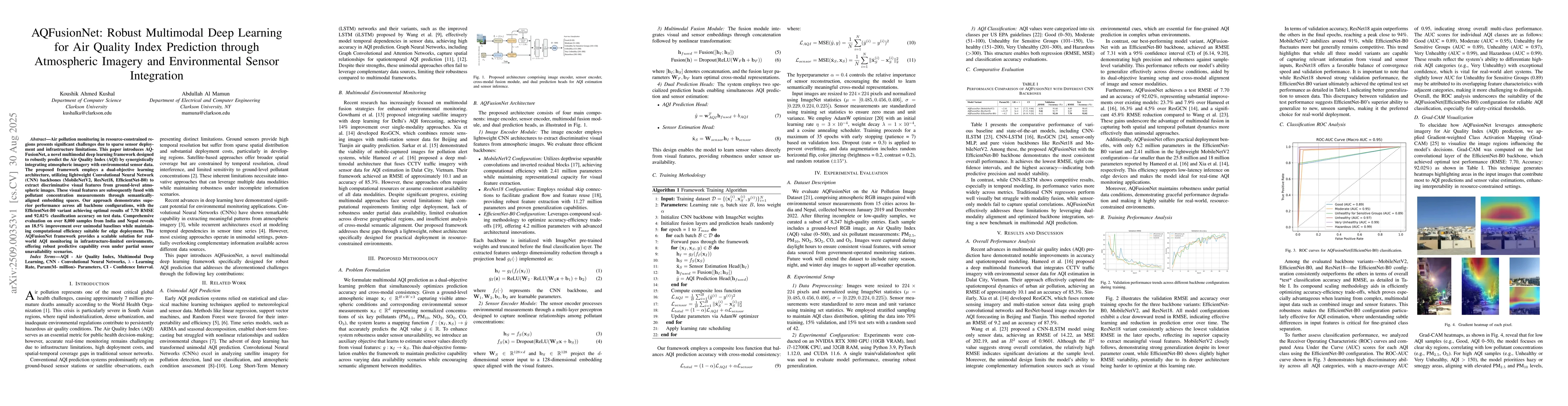 Air pollution monitoring in resource-constrained regions remains challenging due to sparse sensor deployment and limited infrastructure. This work introduces AQFusionNet, a multimodal deep learning framework for robust Air Quality Index (AQI) prediction. The framework integrates ground-level atmospheric imagery with pollutant concentration data using lightweight CNN backbones (MobileNetV2, ResNet18, EfficientNet-B0). Visual and sensor features are combined through semantically aligned embedding spaces, enabling accurate and efficient prediction. Experiments on more than 8,000 samples from India and Nepal demonstrate that AQFusionNet consistently outperforms unimodal baselines, achieving up to 92.02% classification accuracy and an RMSE of 7.70 with the EfficientNet-B0 backbone. The model delivers an 18.5% improvement over single-modality approaches while maintaining low computational overhead, making it suitable for deployment on edge devices. AQFusionNet provides a scalable and practical solution for AQI monitoring in infrastructure-limited environments, offering robust predictive capability even under partial sensor availability.