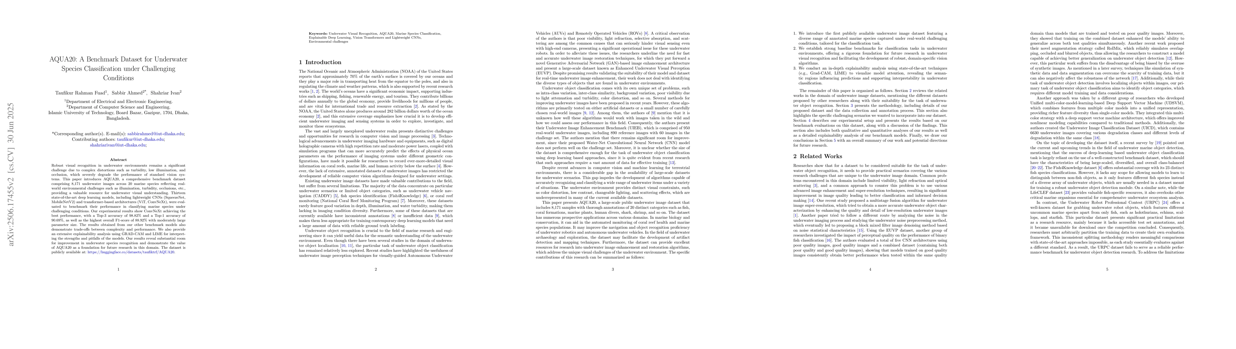 The paper presents AQUA20, a dataset of 8,171 underwater images for classifying 20 marine species under challenging conditions. Experiments with 13 deep learning models reveal ConvNeXt's superior performance, achieving 98.82% Top-3 accuracy and 88.92% F1-score. The dataset is publicly available for future underwater species recognition research at https://huggingface.co/datasets/taufiktrf/AQUA20.