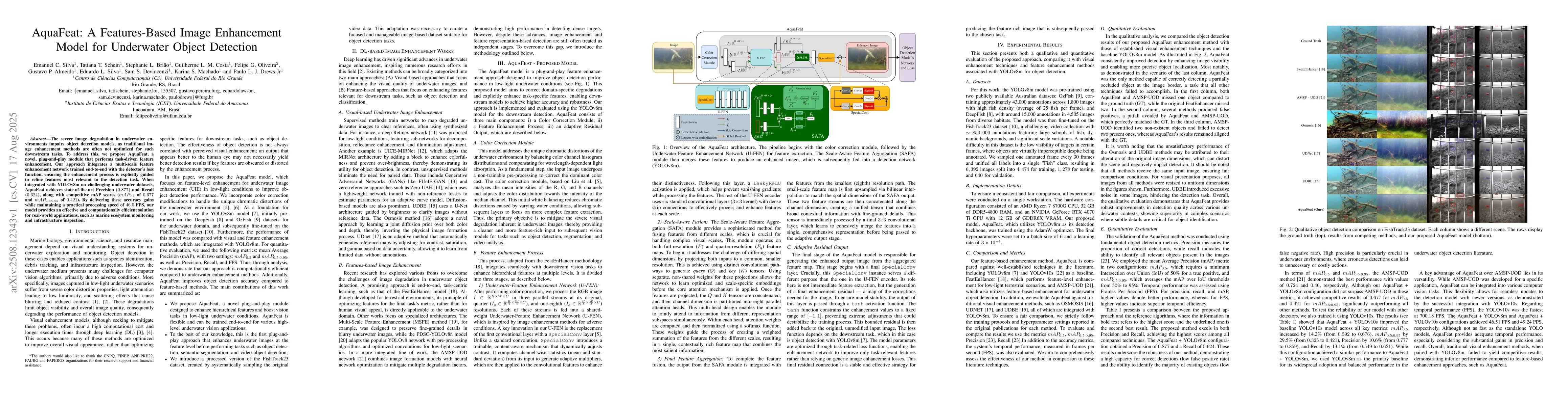 The severe image degradation in underwater environments impairs object detection models, as traditional image enhancement methods are often not optimized for such downstream tasks. To address this, we propose AquaFeat, a novel, plug-and-play module that performs task-driven feature enhancement. Our approach integrates a multi-scale feature enhancement network trained end-to-end with the detector's loss function, ensuring the enhancement process is explicitly guided to refine features most relevant to the detection task. When integrated with YOLOv8m on challenging underwater datasets, AquaFeat achieves state-of-the-art Precision (0.877) and Recall (0.624), along with competitive mAP scores ([email protected] of 0.677 and mAP@[0.5:0.95] of 0.421). By delivering these accuracy gains while maintaining a practical processing speed of 46.5 FPS, our model provides an effective and computationally efficient solution for real-world applications, such as marine ecosystem monitoring and infrastructure inspection.