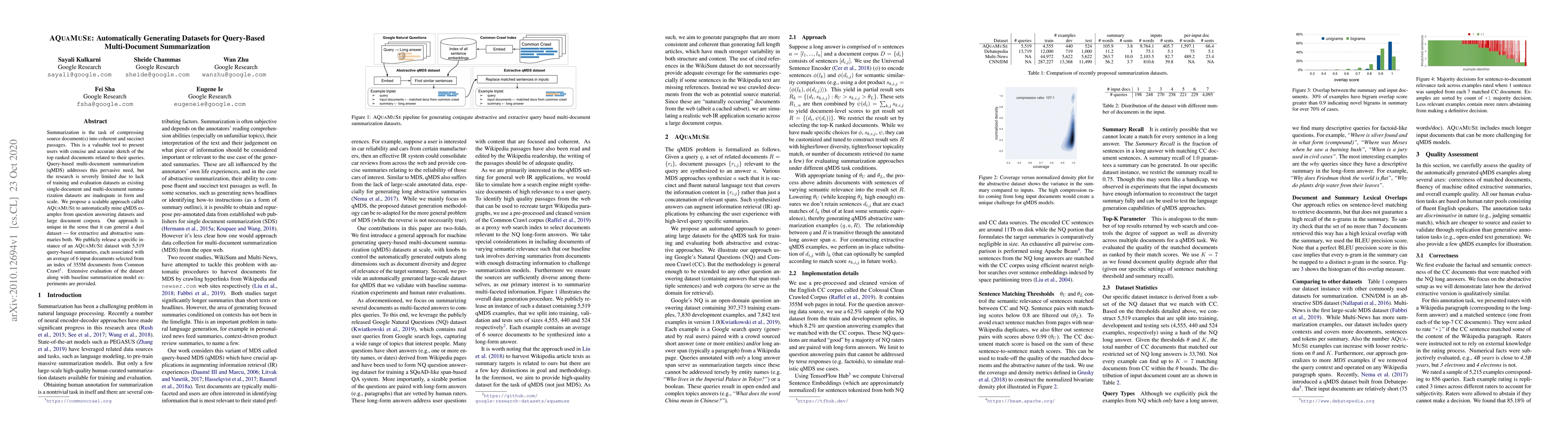 The paper introduces AQuaMuSe, a scalable method for automatically generating datasets for query-based multi-document summarization, addressing the lack of suitable training and evaluation datasets. The approach mines examples from question answering datasets and large document corpora, releasing a dataset with 5,519 query-based summaries and associated documents.