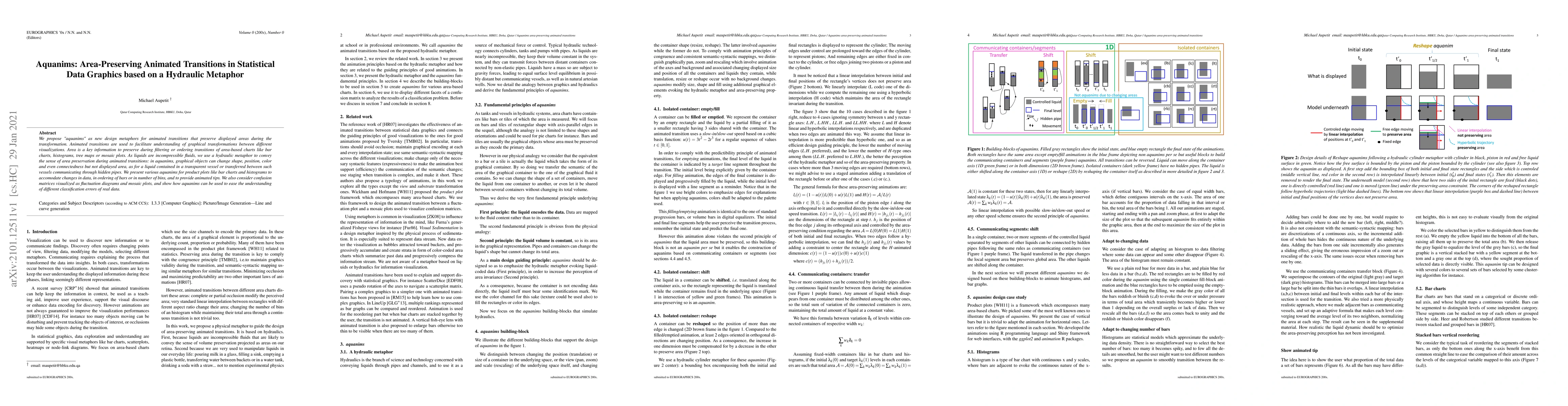 "Aquanims" introduces animated transitions that maintain displayed areas during transformations, using a hydraulic metaphor to ensure area preservation in visualizations like bar charts and histograms. This approach facilitates understanding of changes in data and classification errors.