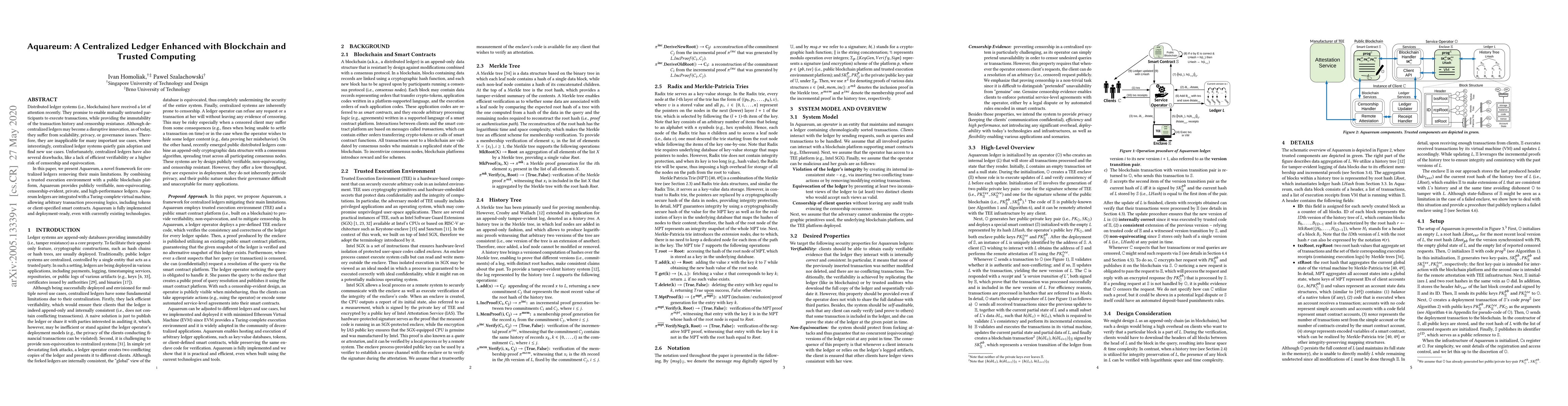 Aquareum combines a trusted execution environment with a public blockchain to create centralized ledgers that offer verifiability, privacy, and high performance, addressing the scalability and governance issues of decentralized ledgers. It is fully implemented and ready for deployment.