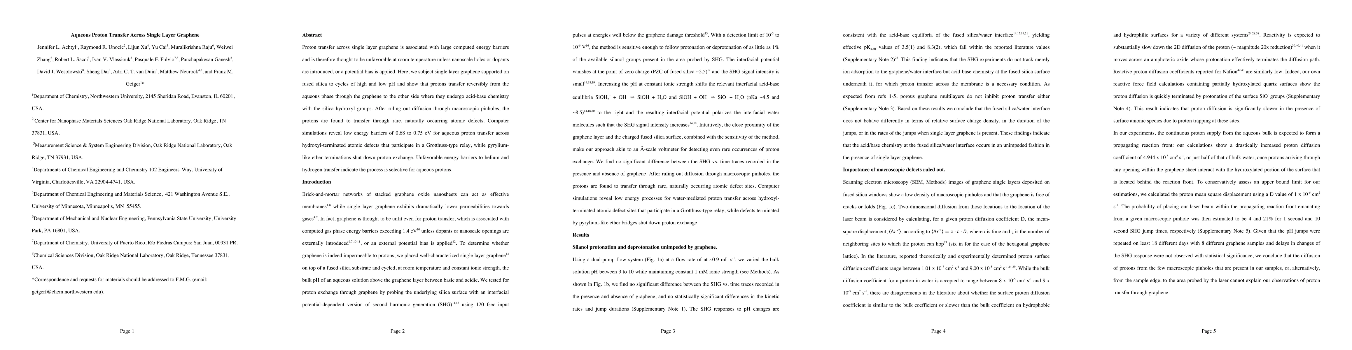 This study demonstrates reversible proton transfer across single layer graphene through naturally occurring atomic defects, facilitated by low energy barriers and a Grotthuss-type relay mechanism. Protons transfer from the aqueous phase to silica, avoiding macroscopic pinholes and showing selectivity over helium and hydrogen transfer.