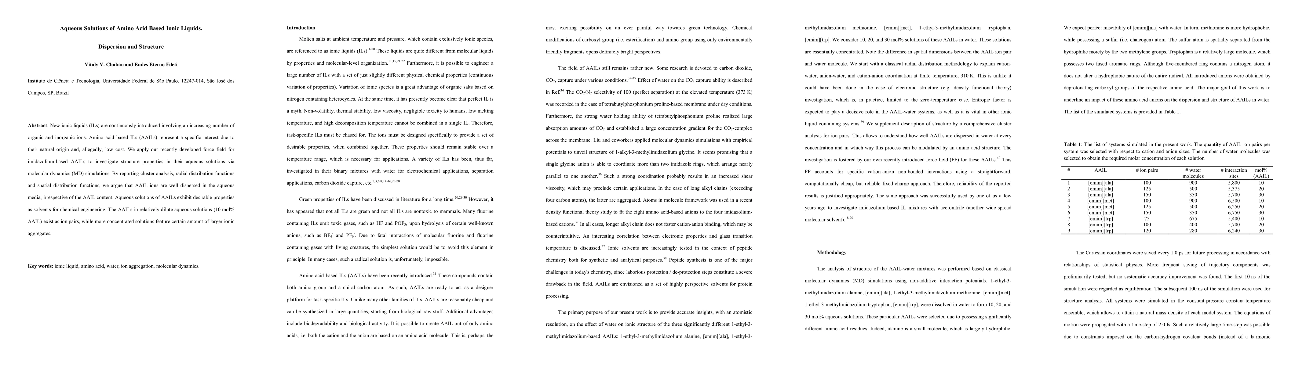 This paper explores the dispersion and structure of aqueous solutions of amino acid based ionic liquids (AAILs) using molecular dynamics simulations. The findings indicate that AAIL ions are well dispersed in water, with ion pairs forming in dilute solutions and larger aggregates appearing in more concentrated solutions, suggesting potential utility as solvents in chemical engineering.