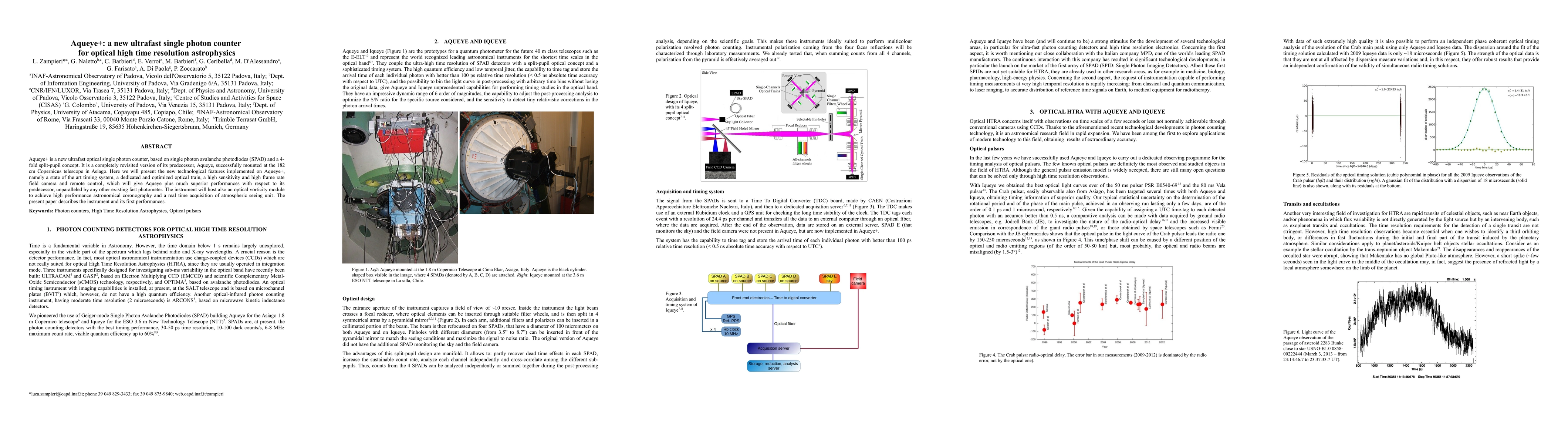 Aqueye+ is a new ultrafast optical single photon counter, based on single photon avalanche photodiodes (SPAD) and a 4-fold split-pupil concept. It is a completely revisited version of its predecessor, Aqueye, successfully mounted at the 182 cm Copernicus telescope in Asiago. Here we will present the new technological features implemented on Aqueye+, namely a state of the art timing system, a dedicated and optimized optical train, a high sensitivity and high frame rate field camera and remote control, which will give Aqueye plus much superior performances with respect to its predecessor, unparalleled by any other existing fast photometer. The instrument will host also an optical vorticity module to achieve high performance astronomical coronography and a real time acquisition of atmospheric seeing unit. The present paper describes the instrument and its first performances.