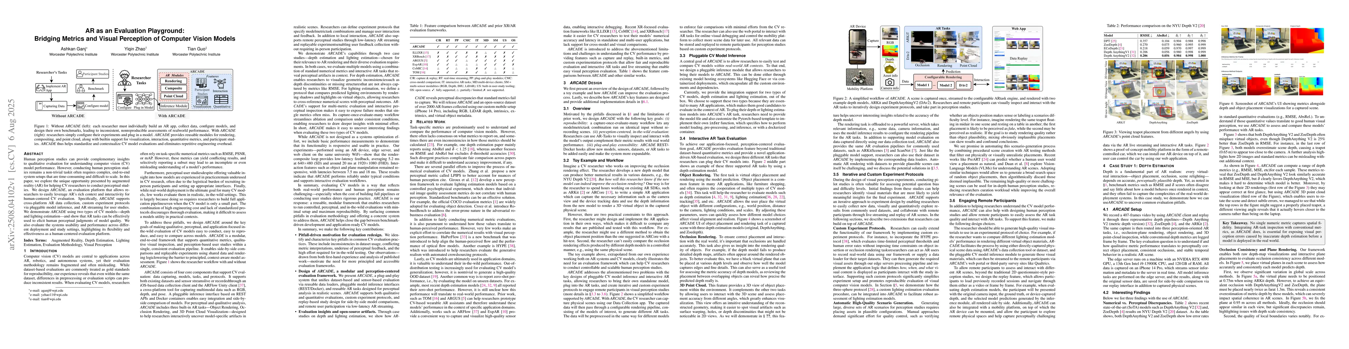 Human perception studies can provide complementary insights to qualitative evaluation for understanding computer vision (CV) model performance. However, conducting human perception studies remains a non-trivial task, it often requires complex, end-to-end system setups that are time-consuming and difficult to scale. In this paper, we explore the unique opportunity presented by augmented reality (AR) for helping CV researchers to conduct perceptual studies. We design ARCADE, an evaluation platform that allows researchers to easily leverage AR's rich context and interactivity for human-centered CV evaluation. Specifically, ARCADE supports cross-platform AR data collection, custom experiment protocols via pluggable model inference, and AR streaming for user studies. We demonstrate ARCADE using two types of CV models, depth and lighting estimation and show that AR tasks can be effectively used to elicit human perceptual judgments of model quality. We also evaluate the systems usability and performance across different deployment and study settings, highlighting its flexibility and effectiveness as a human-centered evaluation platform.