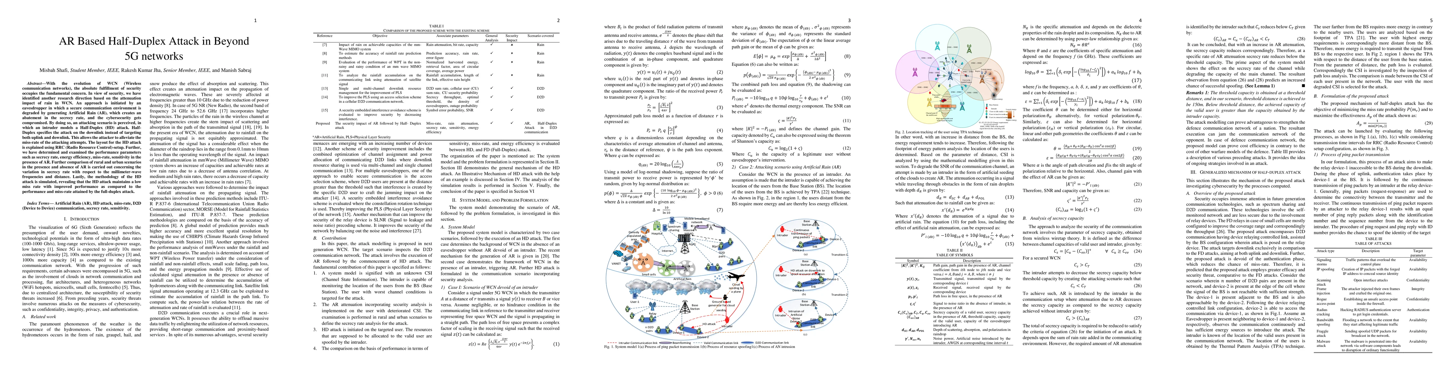 With the evolution of WCN (Wireless communication networks), the absolute fulfillment of security occupies the fundamental concern. In view of security, we have identified another research direction based on the attenuation impact of rain in WCN. An approach is initiated by an eavesdropper in which a secure communication environment is degraded by generating Artificial Rain (AR), which creates an abatement in the secrecy rate, and the cybersecurity gets compromised. By doing so, an attacking scenario is perceived, in which an intruder models a Half-Duplex (HD) attack. Half-Duplex specifies the attack on the downlink instead of targeting both uplink and downlink. This allows the attacker to alleviate the miss-rate of the attacking attempts. The layout for the HD attack is explained using RRC (Radio Resource Control)-setup. Further, we have determined and examined the performance parameters such as secrecy rate, energy efficiency, miss-rate, sensitivity in the presence of AR. Further comparison of rural and urban scenarios in the presence and absence of AR is carried out concerning the variation in secrecy rate with respect to the millimeter-wave frequencies and distance. Lastly, the methodology of the HD attack is simulated, revealing that the HD attack maintains a low miss rate with improved performance as compared to the performance and miss-rate attained by the full-duplex attack