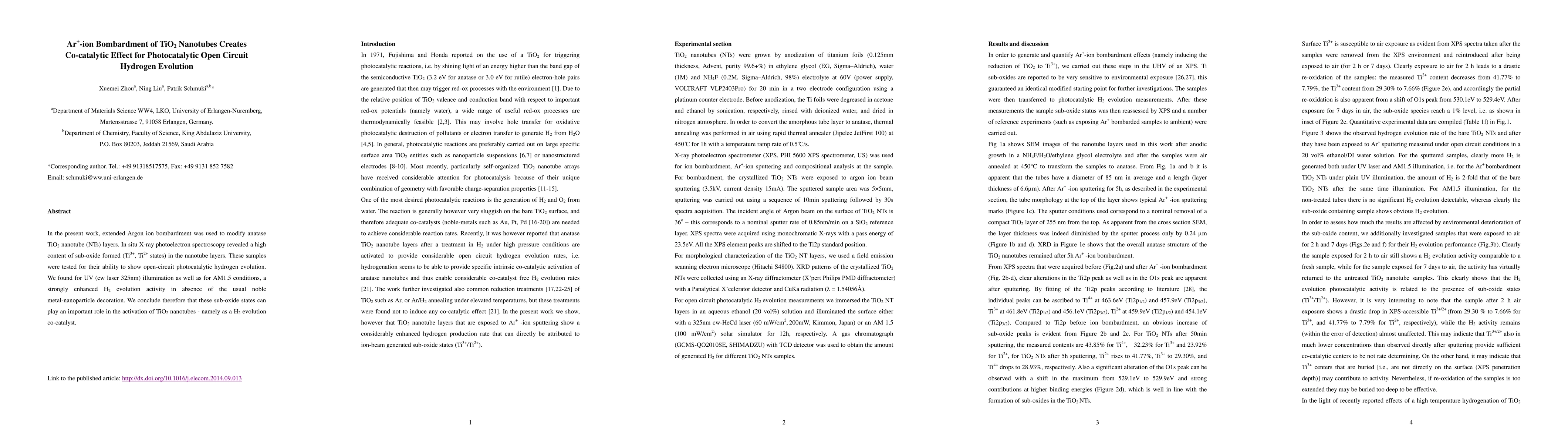 This study demonstrates that Ar+-ion bombardment of TiO2 nanotubes creates a co-catalytic effect for photocatalytic hydrogen evolution, revealing enhanced H2 production activity due to the formation of sub-oxide states (Ti3+, Ti2+), functioning as an effective co-catalyst without noble metal decoration.