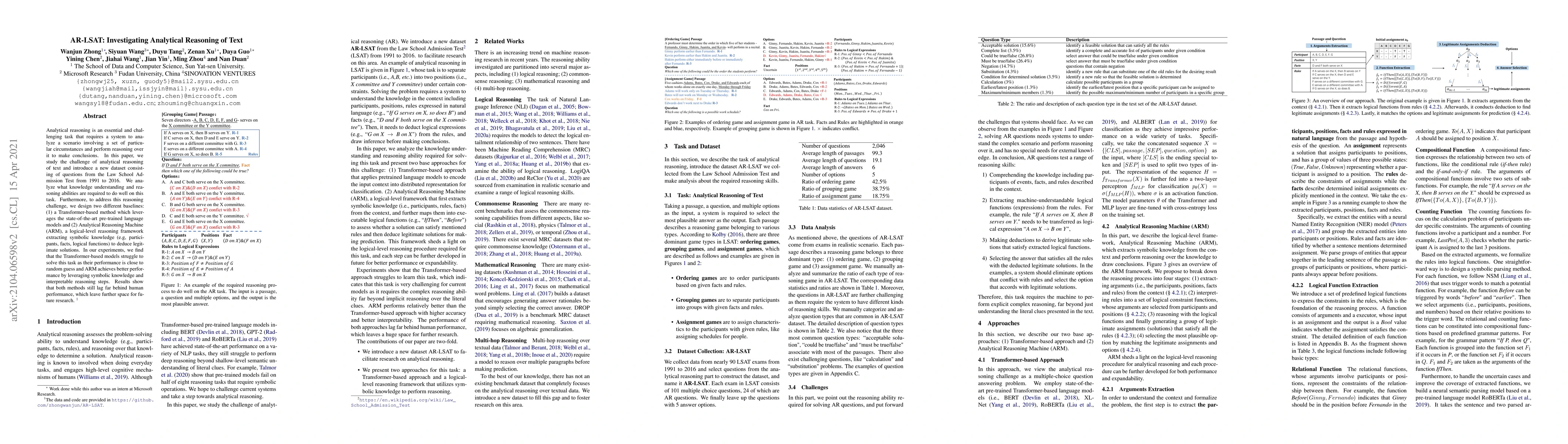 This paper introduces AR-LSAT, a dataset of analytical reasoning questions from the Law School Admission Test. It compares two baseline methods: a Transformer-based model and Analytical Reasoning Machine (ARM). While Transformer models perform poorly, ARM, which extracts symbolic knowledge, shows better results. However, both methods underperform human capabilities, indicating room for improvement.