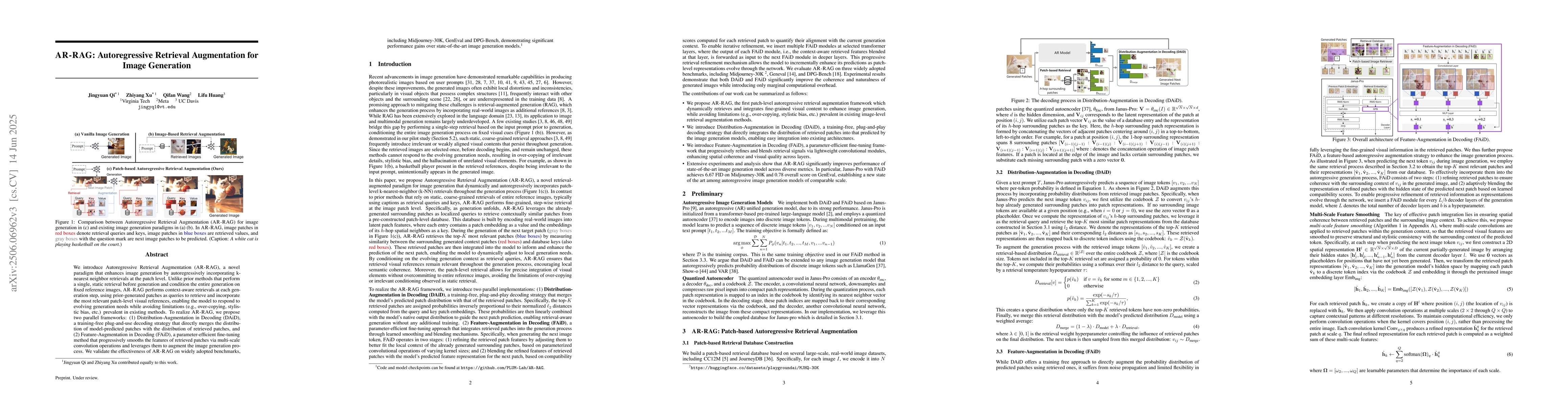 AR-RAG enhances image generation by autoregressively incorporating nearest neighbor retrievals at the patch level, improving upon existing methods by responding to evolving generation needs.