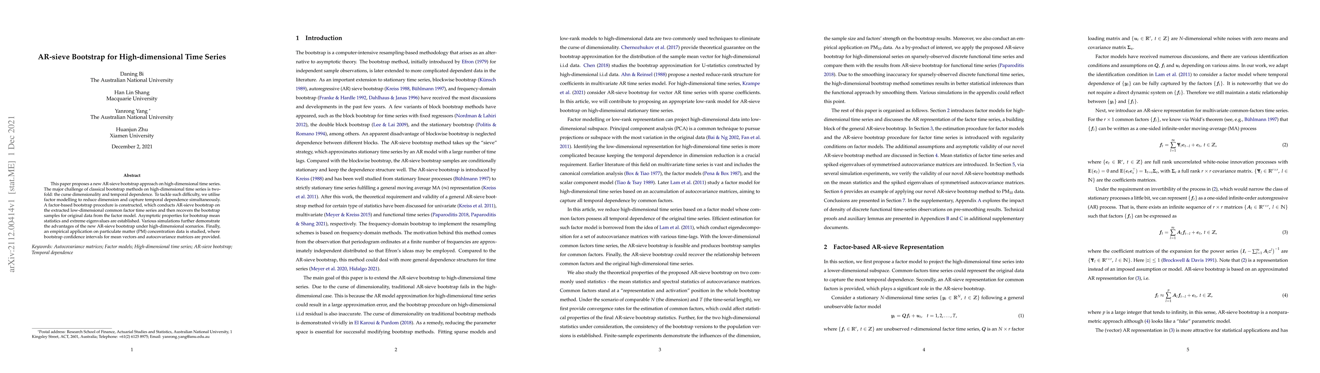 This paper introduces an AR-sieve bootstrap method for high-dimensional time series, addressing the challenges of dimensionality and temporal dependence through factor modelling. The proposed factor-based bootstrap procedure demonstrates improved performance in simulations and is applied to PM concentration data.
