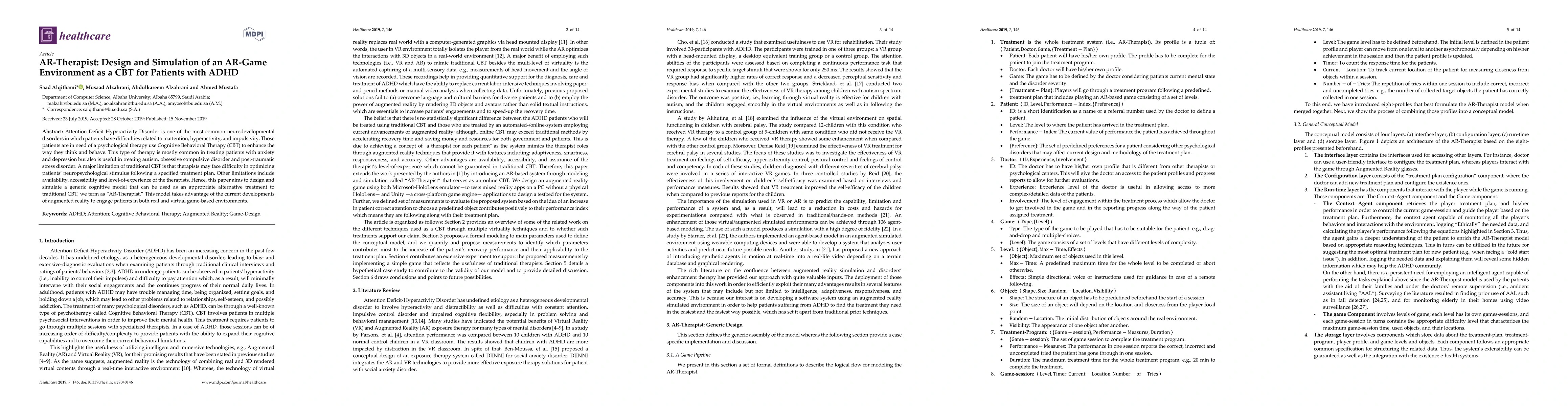 Attention Deficit Hyperactivity Disorder is one of the most common neurodevelopmental disorders in which patients have difficulties related to inattention, hyperactivity, and impulsivity. Those patients are in need of a psychological therapy use Cognitive Behavioral Therapy (CBT) to enhance the way they think and behave. This type of therapy is mostly common in treating patients with anxiety and depression but also is useful in treating autism, obsessive compulsive disorder and post-traumatic stress disorder. A major limitation of traditional CBT is that therapists may face difficulty in optimizing patients' neuropsychological stimulus following a specified treatment plan. Other limitations include availability, accessibility and level-of-experience of the therapists. Hence, this paper aims to design and simulate a generic cognitive model that can be used as an appropriate alternative treatment to traditional CBT, we term as "AR-Therapist." This model takes advantage of the current developments of augmented reality to engage patients in both real and virtual game-based environments.