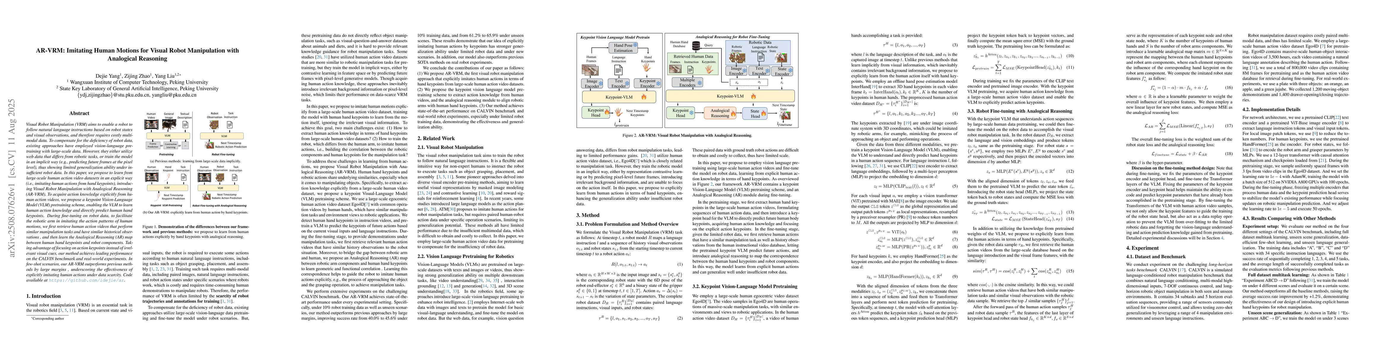 The paper introduces a keypoint Vision-Language Model (VLM) pretraining scheme and an Analogical Reasoning (AR) map to facilitate robotic arm imitation of human motions.