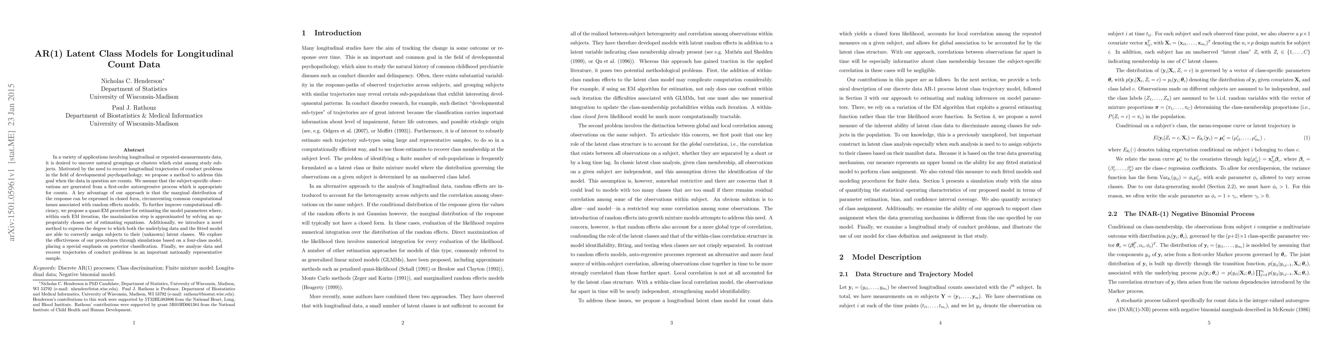 In a variety of applications involving longitudinal or repeated-measurements data, it is desired to uncover natural groupings or clusters which exist among study subjects. Motivated by the need to recover longitudinal trajectories of conduct problems in the field of developmental psychopathology, we propose a method to address this goal when the data in question are counts. We assume that the subject-specific observations are generated from a first-order autoregressive process which is appropriate for counts. A key advantage of our approach is that the marginal distribution of the response can be expressed in closed form, circumventing common computational issues associated with random effects models. To further improve computational efficiency, we propose a quasi-EM procedure for estimating the model parameters where, within each EM iteration, the maximization step is approximated by solving an appropriately chosen set of estimating equations. Additionally, we introduce a novel method to express the degree to which both the underlying data and the fitted model are able to correctly assign subjects to their (unknown) latent classes. We explore the effectiveness of our procedures through simulations based on a four-class model, placing a special emphasis on posterior classification. Finally, we analyze data and recover trajectories of conduct problems in an important nationally representative sample.