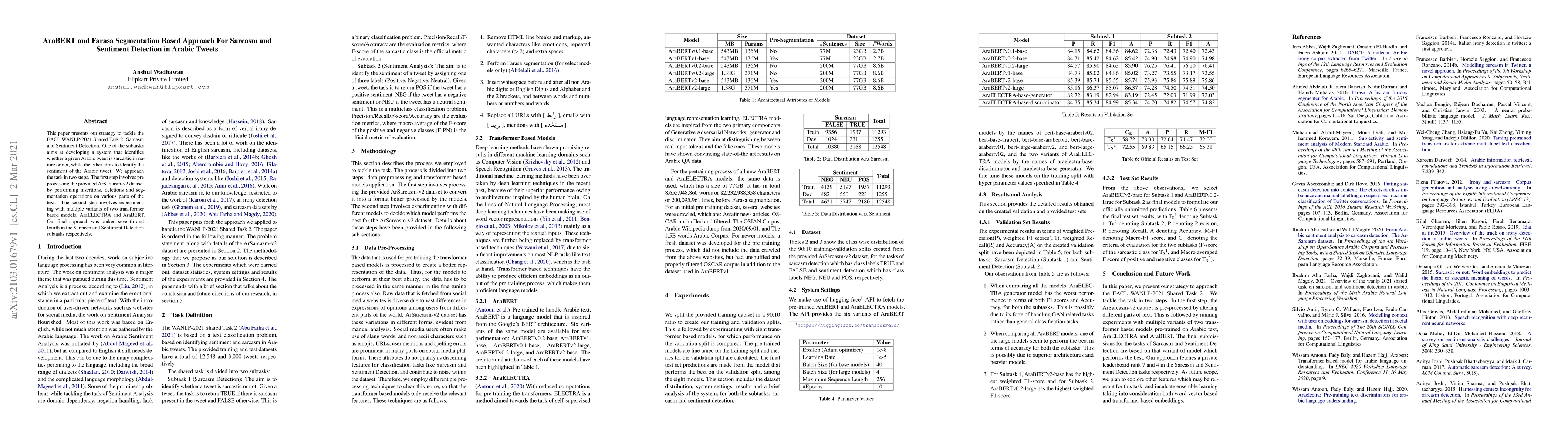 This paper presents our strategy to tackle the EACL WANLP-2021 Shared Task 2: Sarcasm and Sentiment Detection. One of the subtasks aims at developing a system that identifies whether a given Arabic tweet is sarcastic in nature or not, while the other aims to identify the sentiment of the Arabic tweet. We approach the task in two steps. The first step involves pre processing the provided ArSarcasm-v2 dataset by performing insertions, deletions and segmentation operations on various parts of the text. The second step involves experimenting with multiple variants of two transformer based models, AraELECTRA and AraBERT. Our final approach was ranked seventh and fourth in the Sarcasm and Sentiment Detection subtasks respectively.