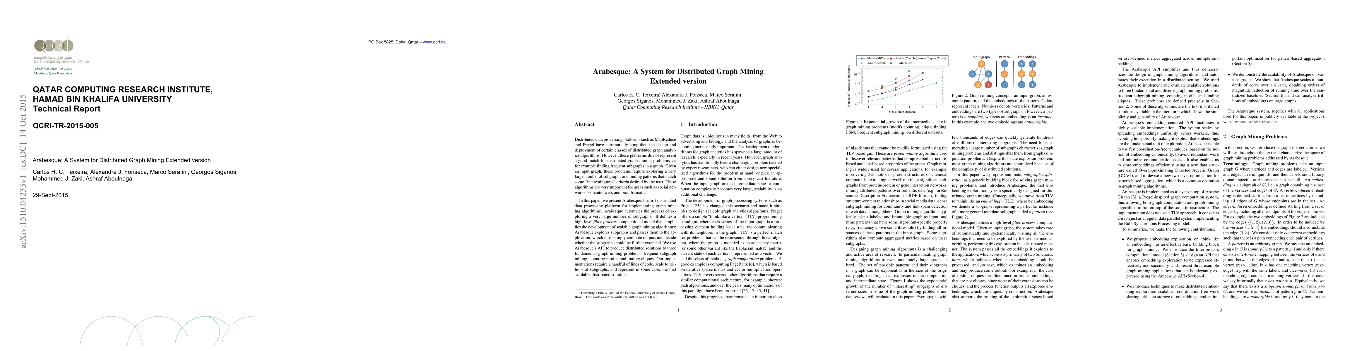 The paper introduces Arabesque, the first distributed data processing platform designed for graph mining algorithms. It automates subgraph exploration, simplifying the development of scalable graph mining solutions for problems like frequent subgraph mining, motif counting, and clique finding, which are crucial in areas such as social networks, semantic web, and bioinformatics.