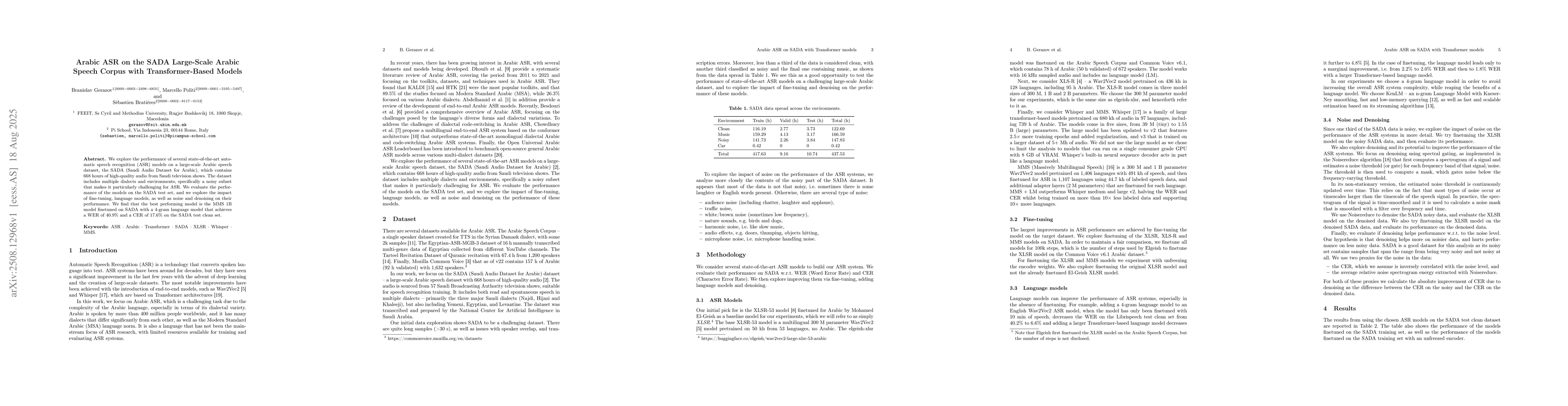 We explore the performance of several state-of-the-art automatic speech recognition (ASR) models on a large-scale Arabic speech dataset, the SADA (Saudi Audio Dataset for Arabic), which contains 668 hours of high-quality audio from Saudi television shows. The dataset includes multiple dialects and environments, specifically a noisy subset that makes it particularly challenging for ASR. We evaluate the performance of the models on the SADA test set, and we explore the impact of fine-tuning, language models, as well as noise and denoising on their performance. We find that the best performing model is the MMS 1B model finetuned on SADA with a 4-gram language model that achieves a WER of 40.9\% and a CER of 17.6\% on the SADA test clean set.