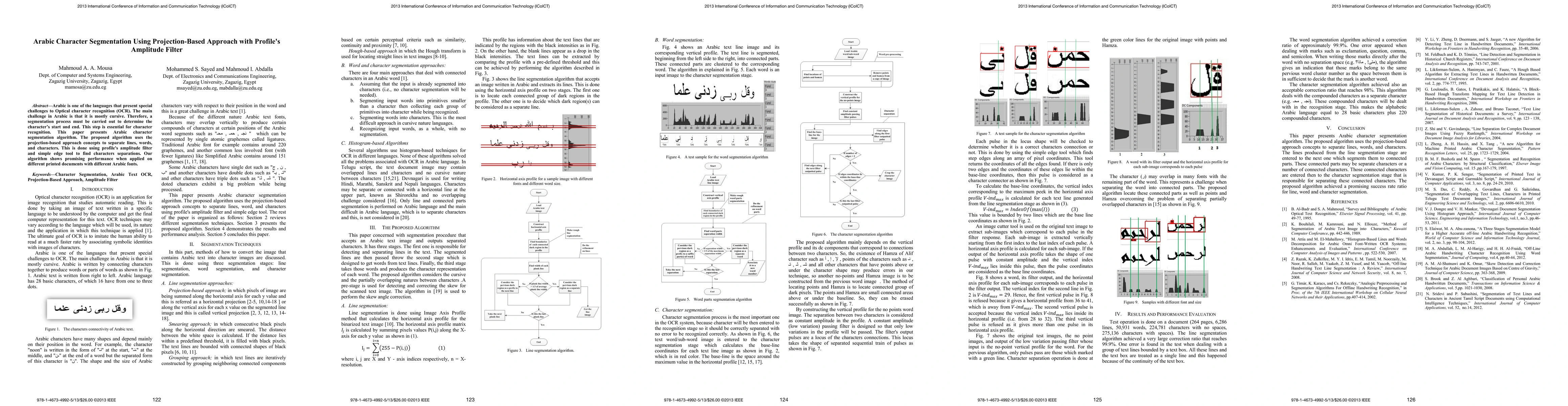 This paper proposes a segmentation algorithm for Arabic characters using a projection-based approach with a profile's amplitude filter. The method effectively separates lines, words, and characters, demonstrating promising performance on various machine-printed Arabic documents.