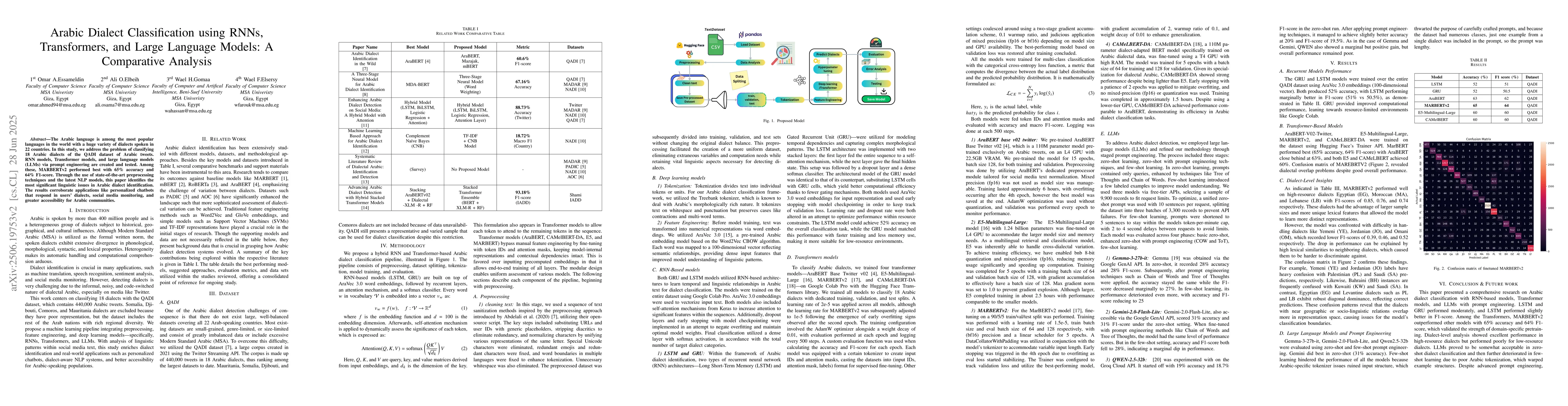 The Arabic language is among the most popular languages in the world with a huge variety of dialects spoken in 22 countries. In this study, we address the problem of classifying 18 Arabic dialects of the QADI dataset of Arabic tweets. RNN models, Transformer models, and large language models (LLMs) via prompt engineering are created and tested. Among these, MARBERTv2 performed best with 65% accuracy and 64% F1-score. Through the use of state-of-the-art preprocessing techniques and the latest NLP models, this paper identifies the most significant linguistic issues in Arabic dialect identification. The results corroborate applications like personalized chatbots that respond in users' dialects, social media monitoring, and greater accessibility for Arabic communities.