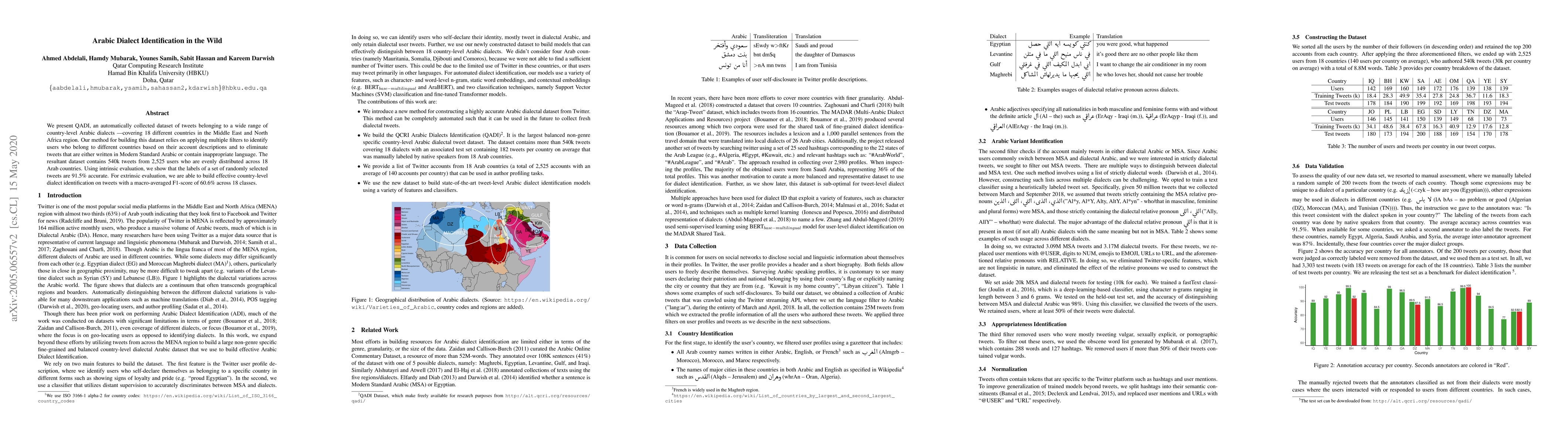 A new dataset of 540k Arabic dialect tweets has been created to improve country-level dialect identification in the wild, with an accuracy rate of 91.5% and a macro-averaged F1-score of 60.6%.