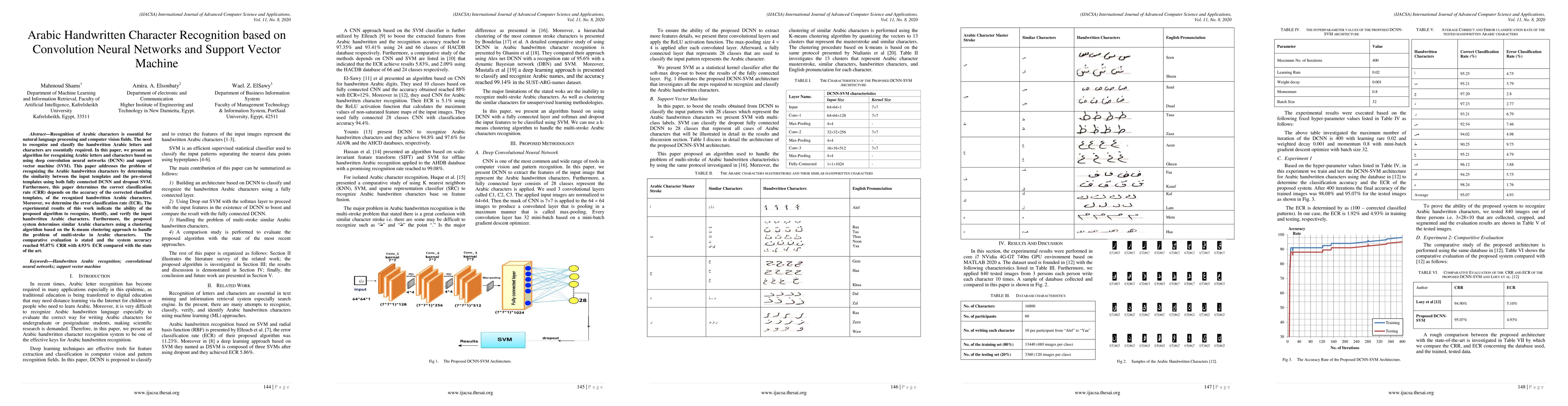 This paper proposes an algorithm for recognizing Arabic handwritten characters using deep convolution neural networks (DCNN) and support vector machine (SVM). The system achieved a high classification accuracy of 95.07% and an error classification rate of 4.93%, outperforming state-of-the-art methods.