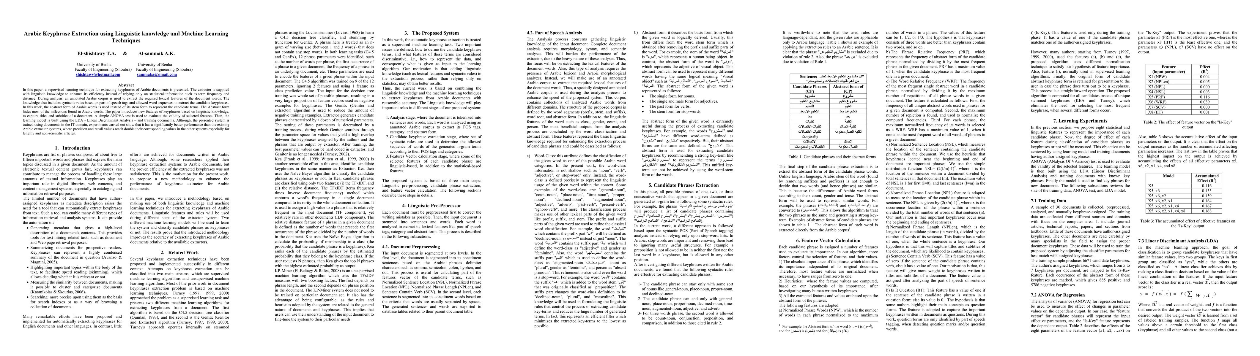 In this paper, a supervised learning technique for extracting keyphrases of Arabic documents is presented. The extractor is supplied with linguistic knowledge to enhance its efficiency instead of relying only on statistical information such as term frequency and distance. During analysis, an annotated Arabic corpus is used to extract the required lexical features of the document words. The knowledge also includes syntactic rules based on part of speech tags and allowed word sequences to extract the candidate keyphrases. In this work, the abstract form of Arabic words is used instead of its stem form to represent the candidate terms. The Abstract form hides most of the inflections found in Arabic words. The paper introduces new features of keyphrases based on linguistic knowledge, to capture titles and subtitles of a document. A simple ANOVA test is used to evaluate the validity of selected features. Then, the learning model is built using the LDA - Linear Discriminant Analysis - and training documents. Although, the presented system is trained using documents in the IT domain, experiments carried out show that it has a significantly better performance than the existing Arabic extractor systems, where precision and recall values reach double their corresponding values in the other systems especially for lengthy and non-scientific articles.