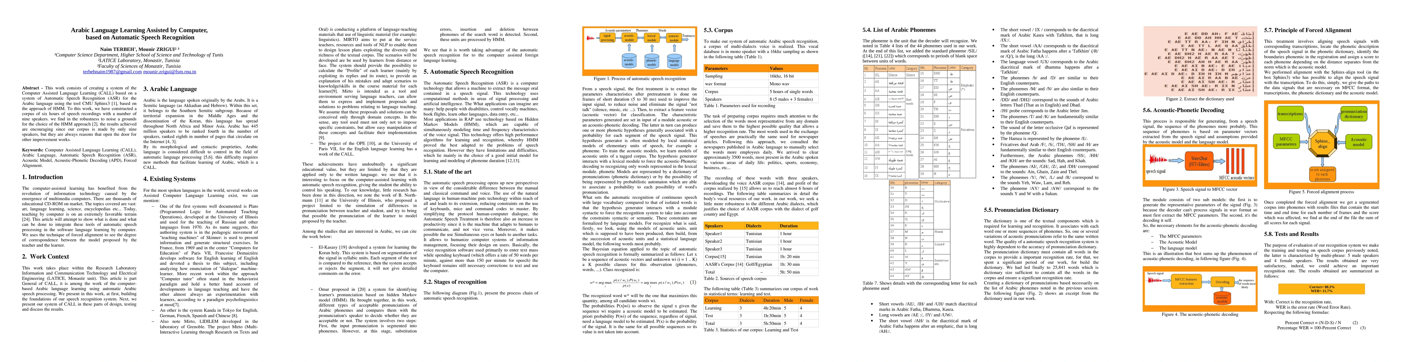 This work consists of creating a system of the Computer Assisted Language Learning (CALL) based on a system of Automatic Speech Recognition (ASR) for the Arabic language using the tool CMU Sphinx3 [1], based on the approach of HMM. To this work, we have constructed a corpus of six hours of speech recordings with a number of nine speakers. we find in the robustness to noise a grounds for the choice of the HMM approach [2]. the results achieved are encouraging since our corpus is made by only nine speakers, but they are always reasons that open the door for other improvement works.