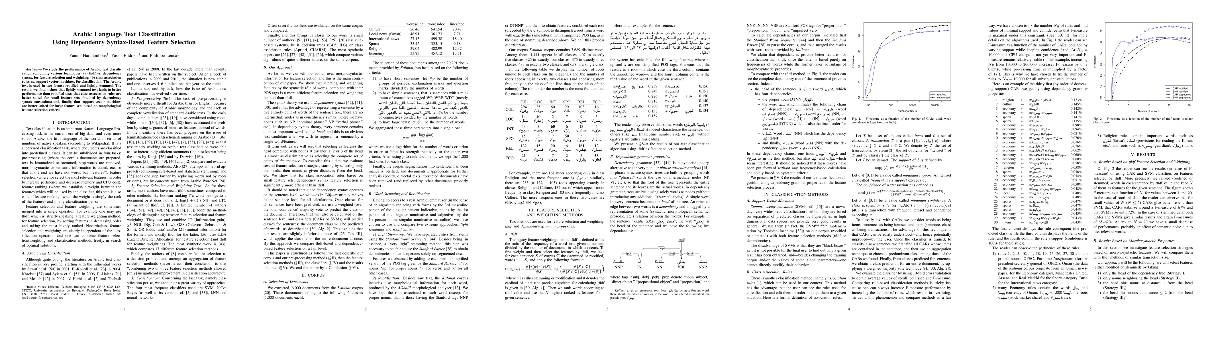 This paper investigates Arabic text classification using dependency syntax-based feature selection, comparing tfidf and dependency syntax methods. It finds that lightly stemmed text outperforms rootified text, with class association rules working better for small feature sets derived from dependency syntax, and support vector machines excelling for larger feature sets based on morphological criteria.