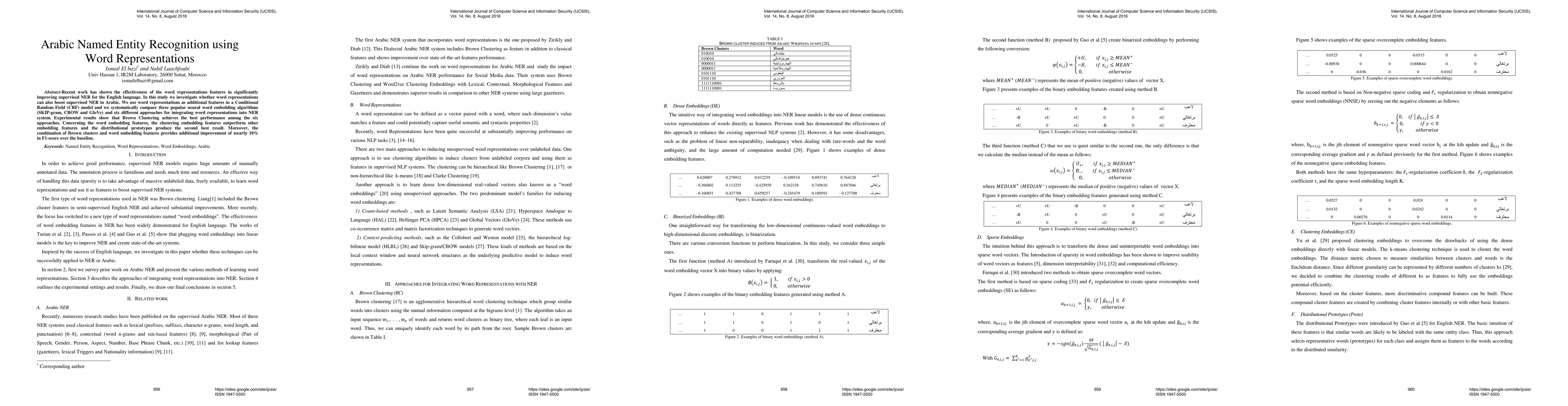 Recent work has shown the effectiveness of the word representations features in significantly improving supervised NER for the English language. In this study we investigate whether word representations can also boost supervised NER in Arabic. We use word representations as additional features in a Conditional Random Field (CRF) model and we systematically compare three popular neural word embedding algorithms (SKIP-gram, CBOW and GloVe) and six different approaches for integrating word representations into NER system. Experimental results show that Brown Clustering achieves the best performance among the six approaches. Concerning the word embedding features, the clustering embedding features outperform other embedding features and the distributional prototypes produce the second best result. Moreover, the combination of Brown clusters and word embedding features provides additional improvement of nearly 10% in F1-score over the baseline.