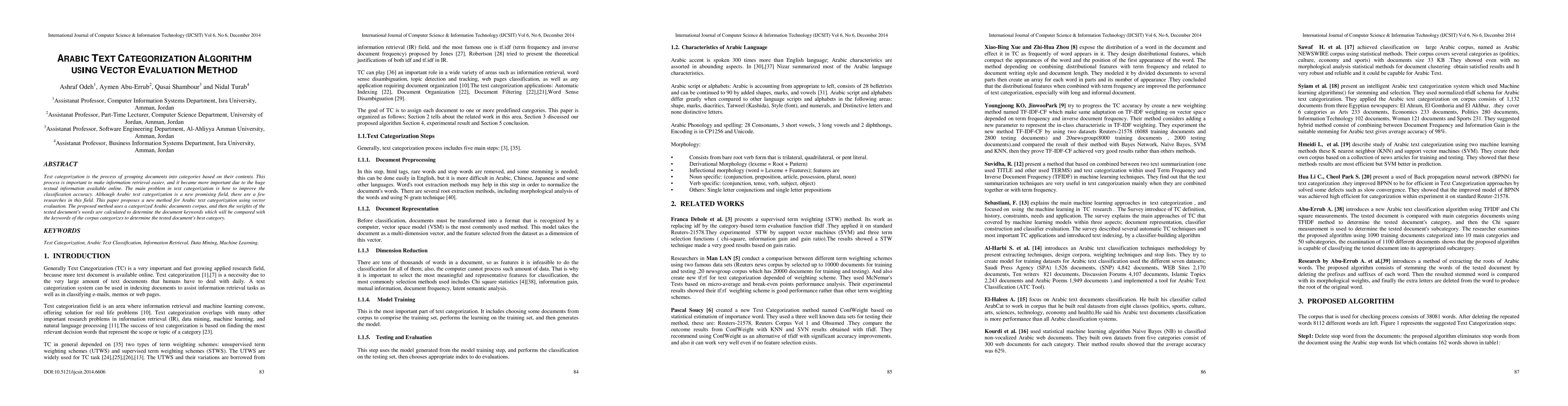 This paper proposes a new method for Arabic text categorization using vector evaluation, aiming to improve classification accuracy by calculating word weights in tested documents and comparing them with keywords from a categorized corpus to determine the best category.