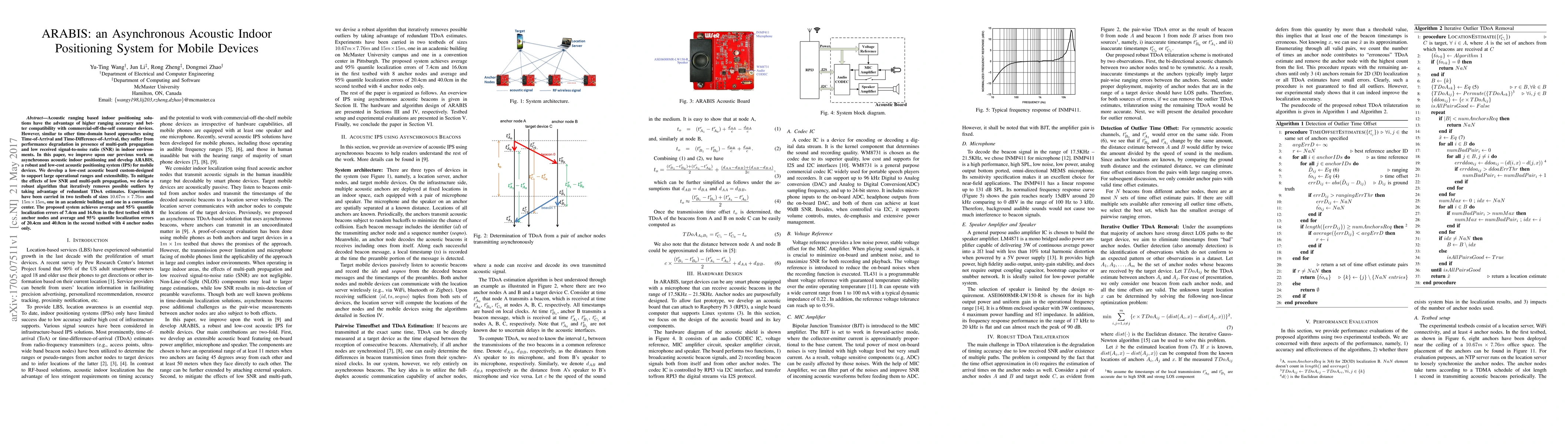ARABIS is an asynchronous acoustic indoor positioning system designed for mobile devices, featuring a custom-designed low-cost acoustic board to enhance accuracy and range. The system employs an algorithm to mitigate multi-path effects and low SNR, achieving average localization errors of 7.4cm and 20.4cm in two test environments.