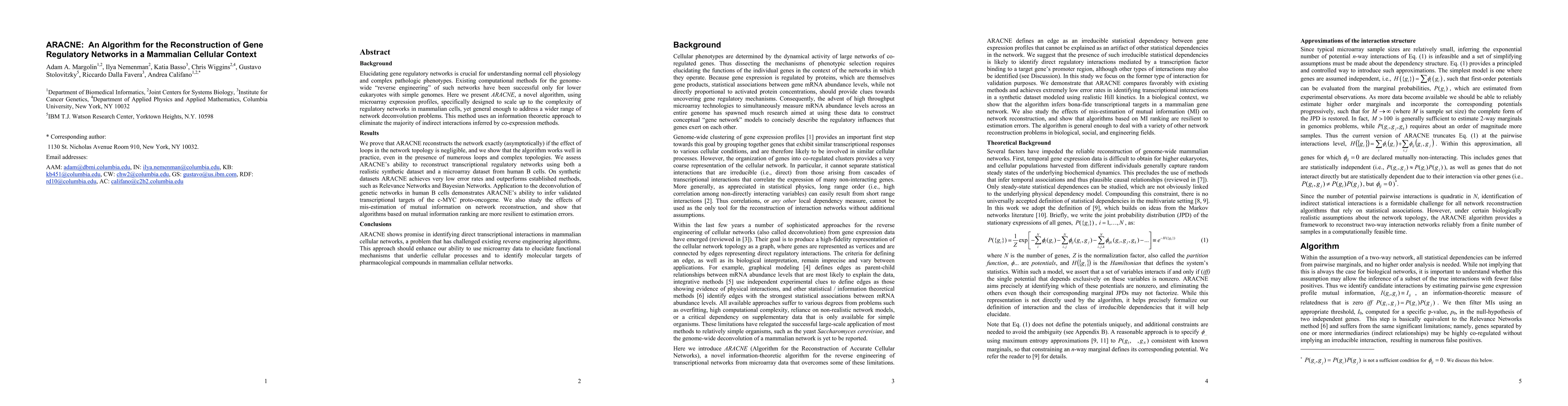ARACNE is a novel algorithm designed for reconstructing gene regulatory networks from microarray expression profiles, specifically tailored for mammalian cells. It outperforms existing methods by using an information theoretic approach to minimize indirect interactions, demonstrating high accuracy even in complex network topologies.