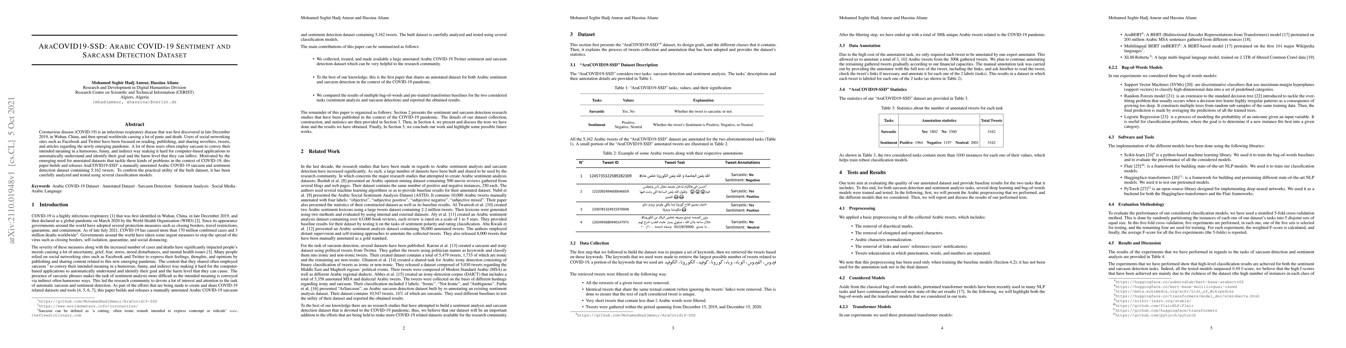 This paper introduces AraCOVID19-SSD, an annotated dataset of 5,162 Arabic tweets containing COVID-19 related sarcasm and sentiment. The dataset aims to aid in developing algorithms to detect sentiment and sarcasm in the context of the pandemic, and its effectiveness is validated through testing with various classification models.
