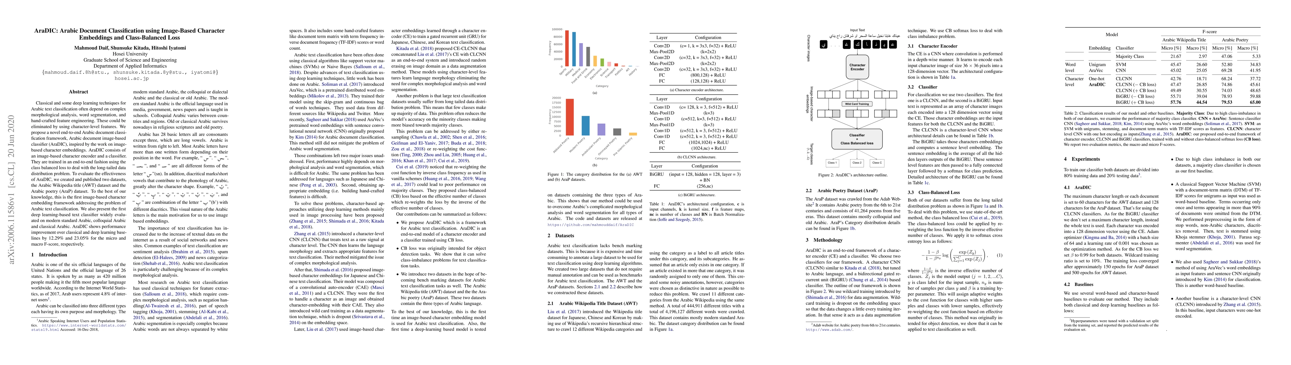 AraDIC proposes an innovative framework for Arabic document classification using image-based character embeddings, eliminating the need for complex morphological analysis. The framework achieves superior performance over classical and deep learning baselines, demonstrating a notable improvement in F-scores.